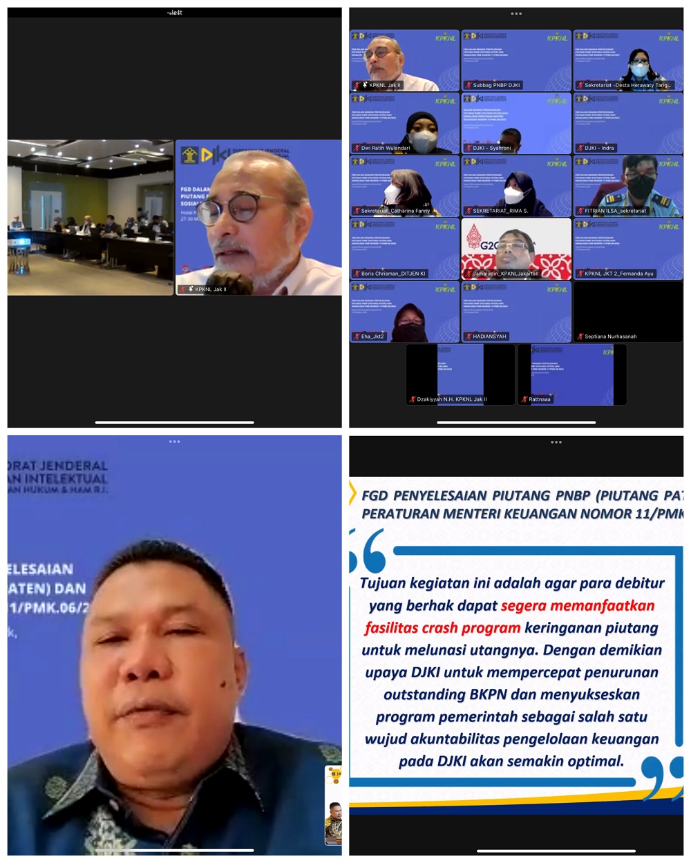 “Tujuan kegiatan ini adalah agar para debitur yang berhak dapat segera memanfaatkan fasilitas crash program keringanan piutang untuk melunasi utangnya. Dengan demikian upaya DJKI untuk mempercepat penurunan outstanding BKPN dan menyukseskan program pemerintah sebagai salah satu wujud akuntabilitas pengelolaan keuangan pada DJKI akan semakin optimal.” Tutur Sekretaris DJKI Sucipto dalam sambutannya melalui Zoom Cloud Meeting.