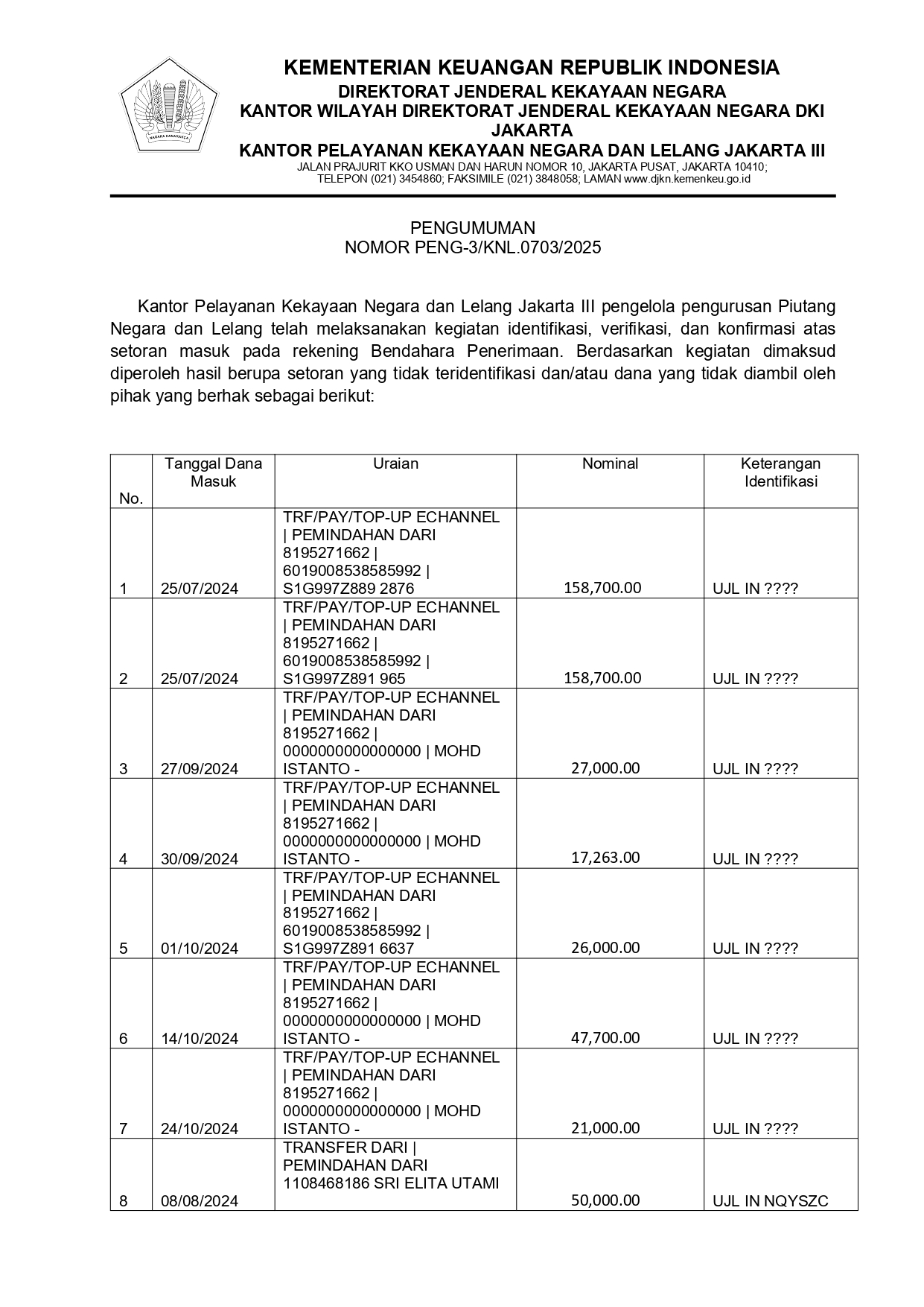 Pengumuman Saldo Mengendap Triwulan III Tahun 2025