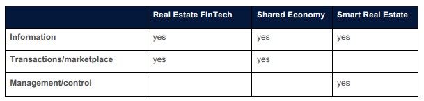 Dari tabel diatas, PropTech didefinisikan sebagai platforms yang dapat berupa Real Estate FinTech, Shared Economy, dan Smart Real Estate. Secara singkat, ketiga lingkup PropTech sebagaimana dijelaskan dalam riset tersebut memiliki produk layanan tertentu yang berbeda-beda seperti: marketplace untuk memfasilitasi suatu transaksi, kegiatan manajemen/operasional real estat dan informasi-informasi lainnya seputar properti.