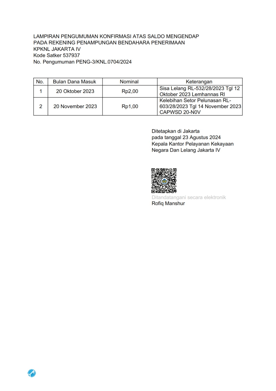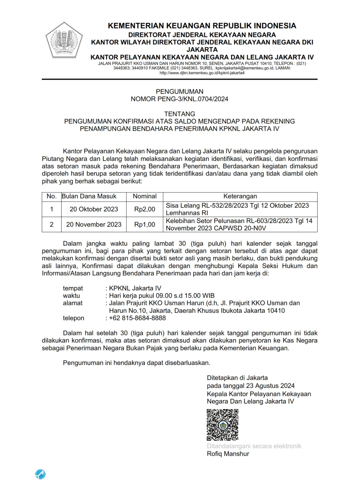 Pengumuman Dana Mengendap Pada Rekening Bendahara Penerima KPKNL Jakarta IV periode 23 Agustus 2024