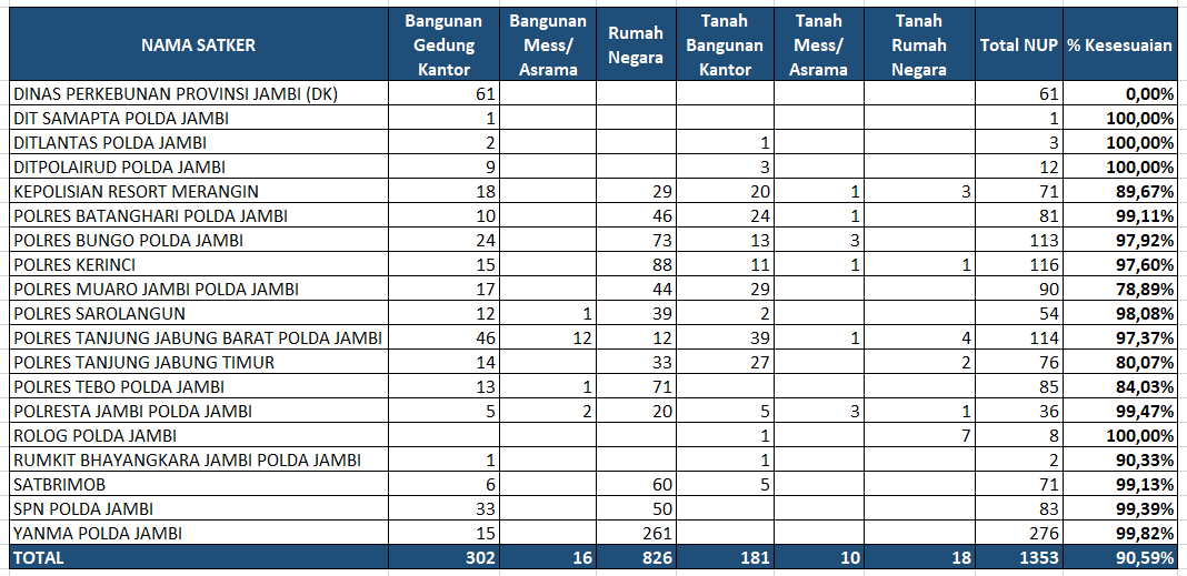 Dengan terciptanya sinergi dan kolaborasi yang baik antara KPKNL Jambi selaku Pengelola Barang dan seluruh Satuan kerja di lingkungan Kepolisian Daerah Provinsi Jambi dan seluruh satker yang berada di bawahnya, kegiatan pendataan dan pengukuran SBSK BMN sebanyak 1.353 NUP BMN dapat diselesaikan pada awal Triwulan IV tahun berjalan, dengan tingkat kesesuaian sebesar 90,59%.
