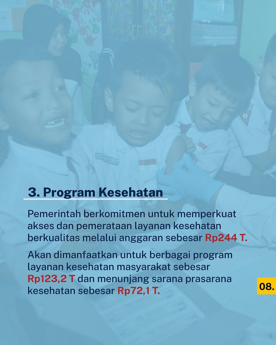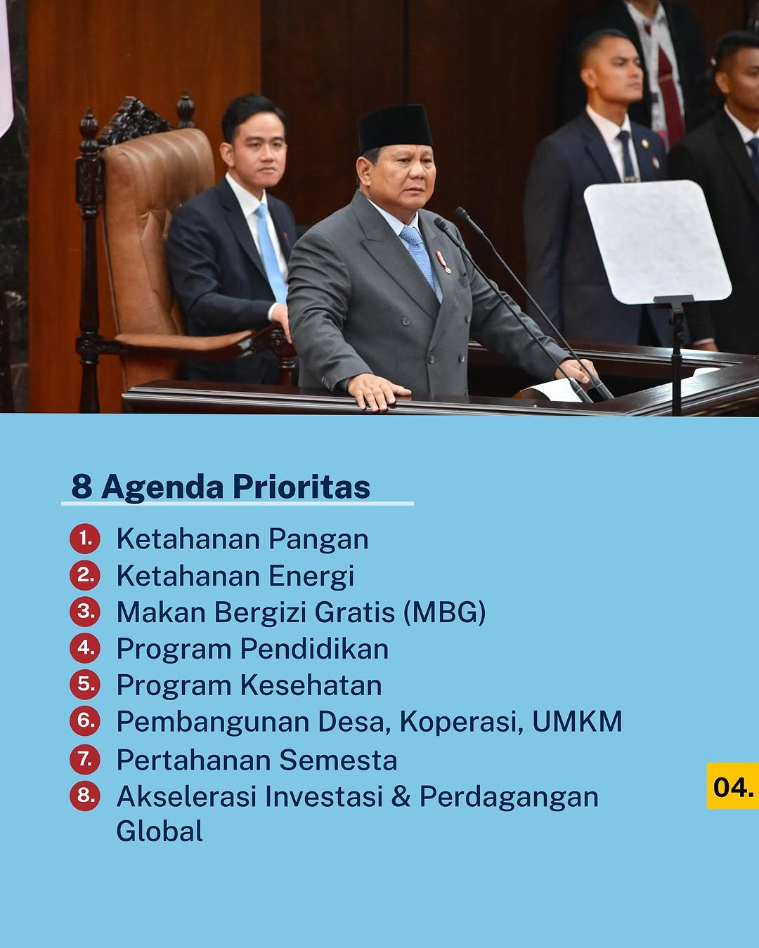 Dalam pidatonya, Presiden Prabowo menekankan pentingnya APBN 2026 sebagai landasan mencapai amanat konstitusi dan menjawab tantangan pembangunan nasional. Terdapat 8 program prioritas yang menjadi fokus utama, yaitu: