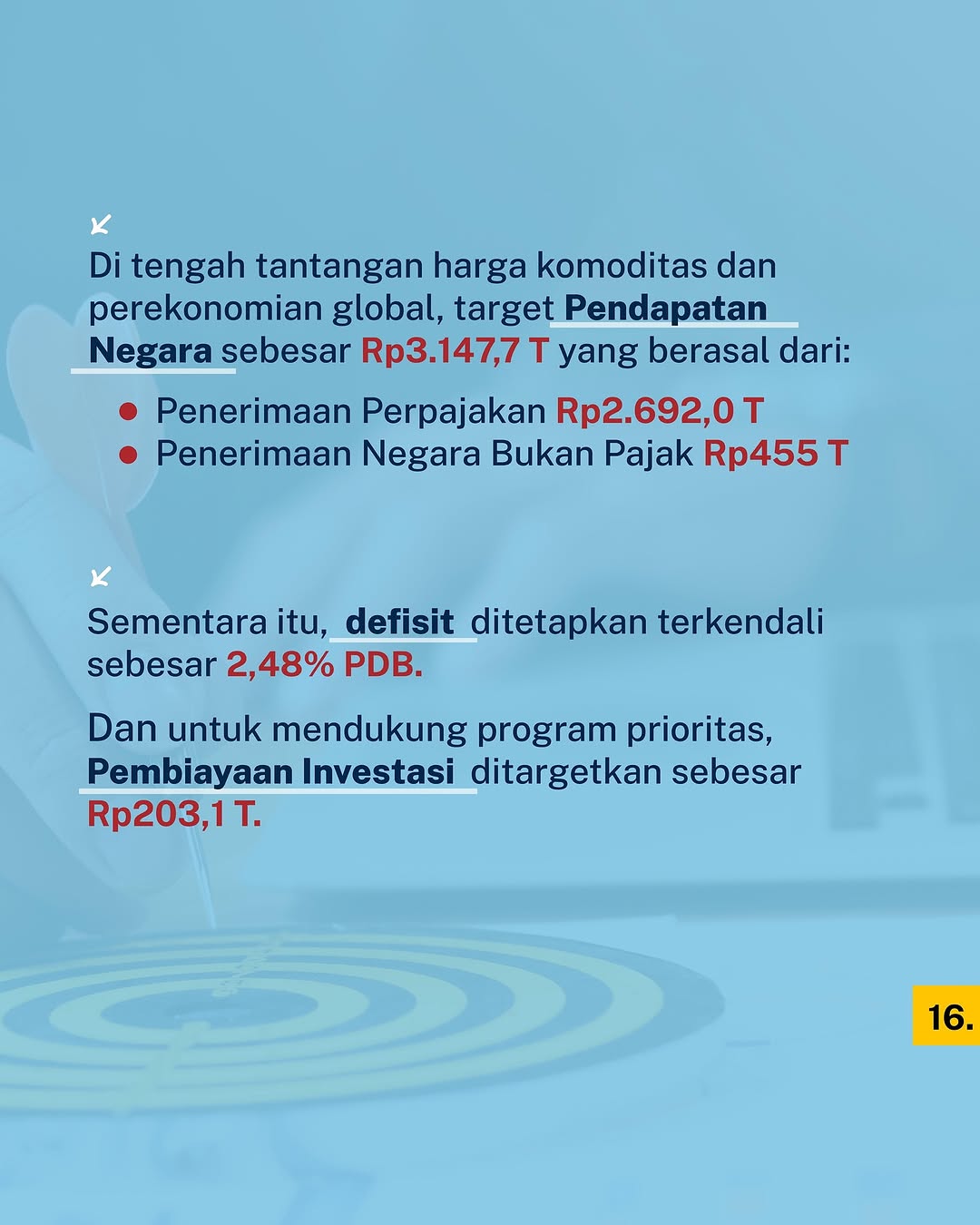 RAPBN 2026 mengusung pendapatan negara sebesar Rp3.147,7 triliun, dengan belanja negara mencapai Rp3.786,5 triliun. Defisit APBN ditetapkan pada 2,48% PDB, yang masih dalam batas aman untuk mendorong pertumbuhan ekonomi.