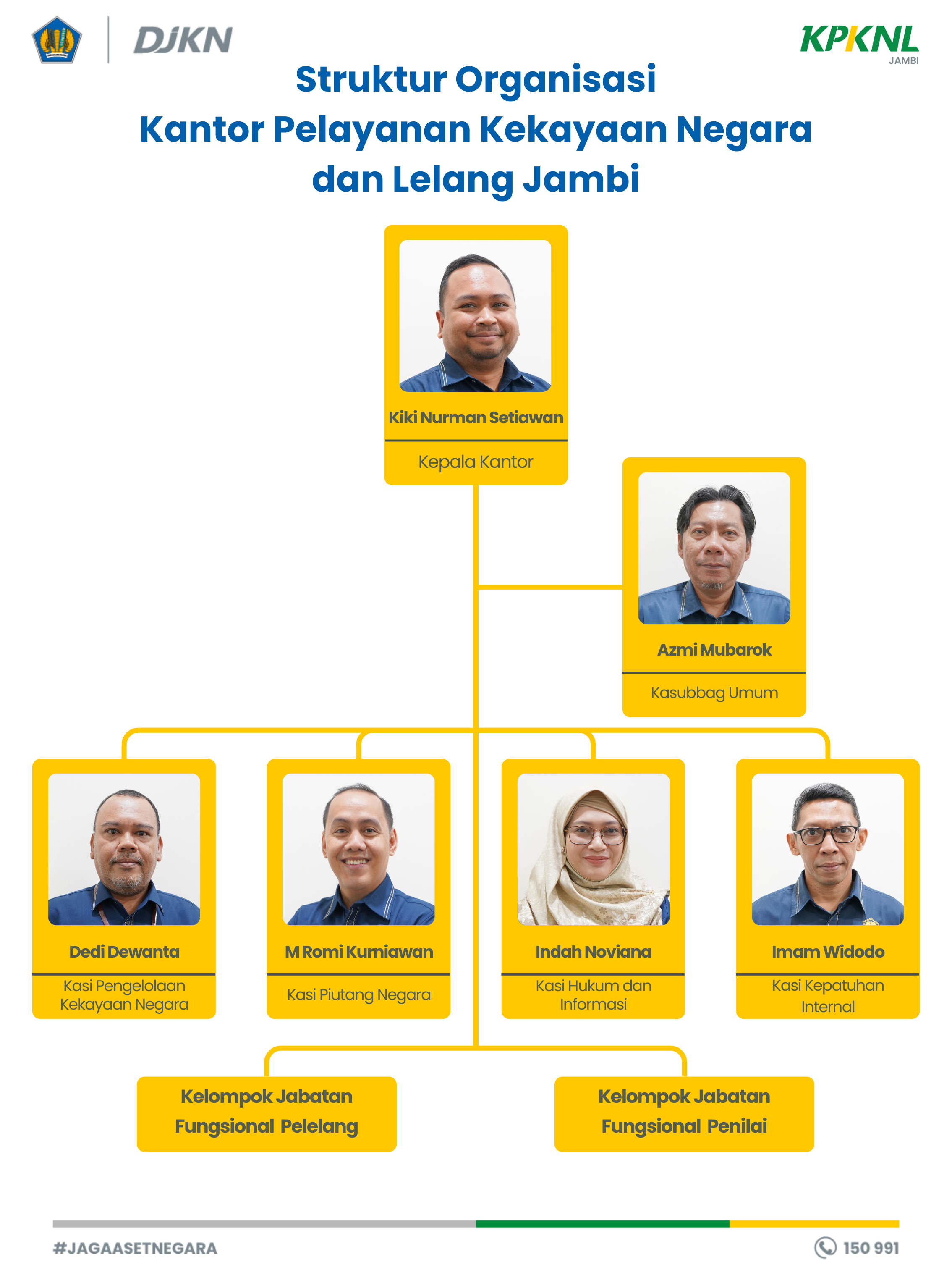 Saat ini, KPKNL Jambi dipimpin oleh Kepala Kantor Kiki Nurman Setiawan, dengan staff Kepala Subbagian Umum Azmi Mubarok; Kepala Seksi Pengelola Kekayaan Negara Dedi Dewanta Brahmana; Kepala Seksi Piutang Negara Muhammad Romi Kurniawan; Kepala Seksi Kepatuhan Internal Imam Widodo; Kepala Seksi Hukum dan Informasi Indah Noviana; Penilai Pemerintah Ahli Muda Kukuh Anggraito; Penilai Pemerintah Ahli Pertama Eko Wahyu Guntoro, dan Decky Fitriadi, Pelelang Ahli Muda Januar Edy Purwoko dan Risman dan dan Marzuki Tayib dan 17 orang Pelaksana.
