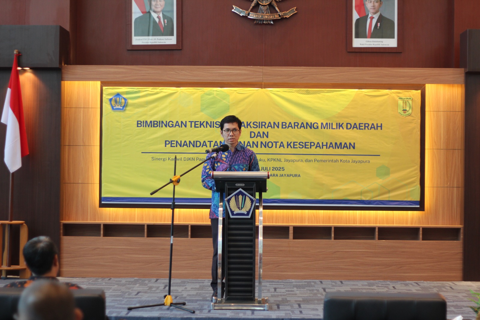 Jayapura, 22 Juli 2025 — Kantor Wilayah Direktorat Jenderal Kekayaan Negara (DJKN) Papua, Papua Barat dan Maluku dan Kantor Pelayanan Kekayaan Negara dan Lelang (KPKNL) Jayapura bersama Pemerintah Kota Jayapura melaksanakan kegiatan Penandatanganan Nota Kesepahaman serta Bimbingan Teknis Penaksiran Barang Milik Daerah (BMD) pada Selasa, 22 Juli 2025, bertempat di Aula Lantai 8, Gedung Keuangan Negara Jayapura.