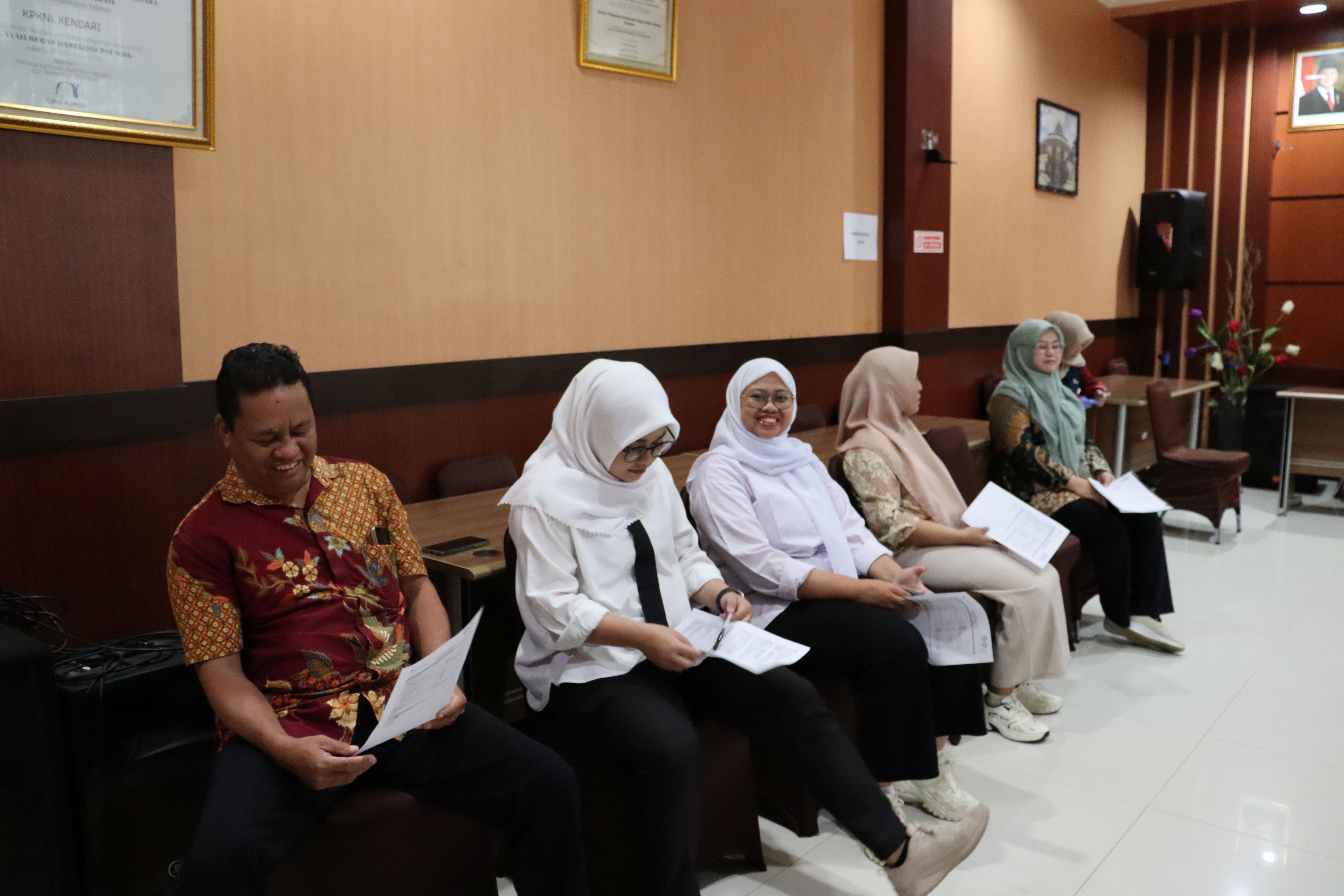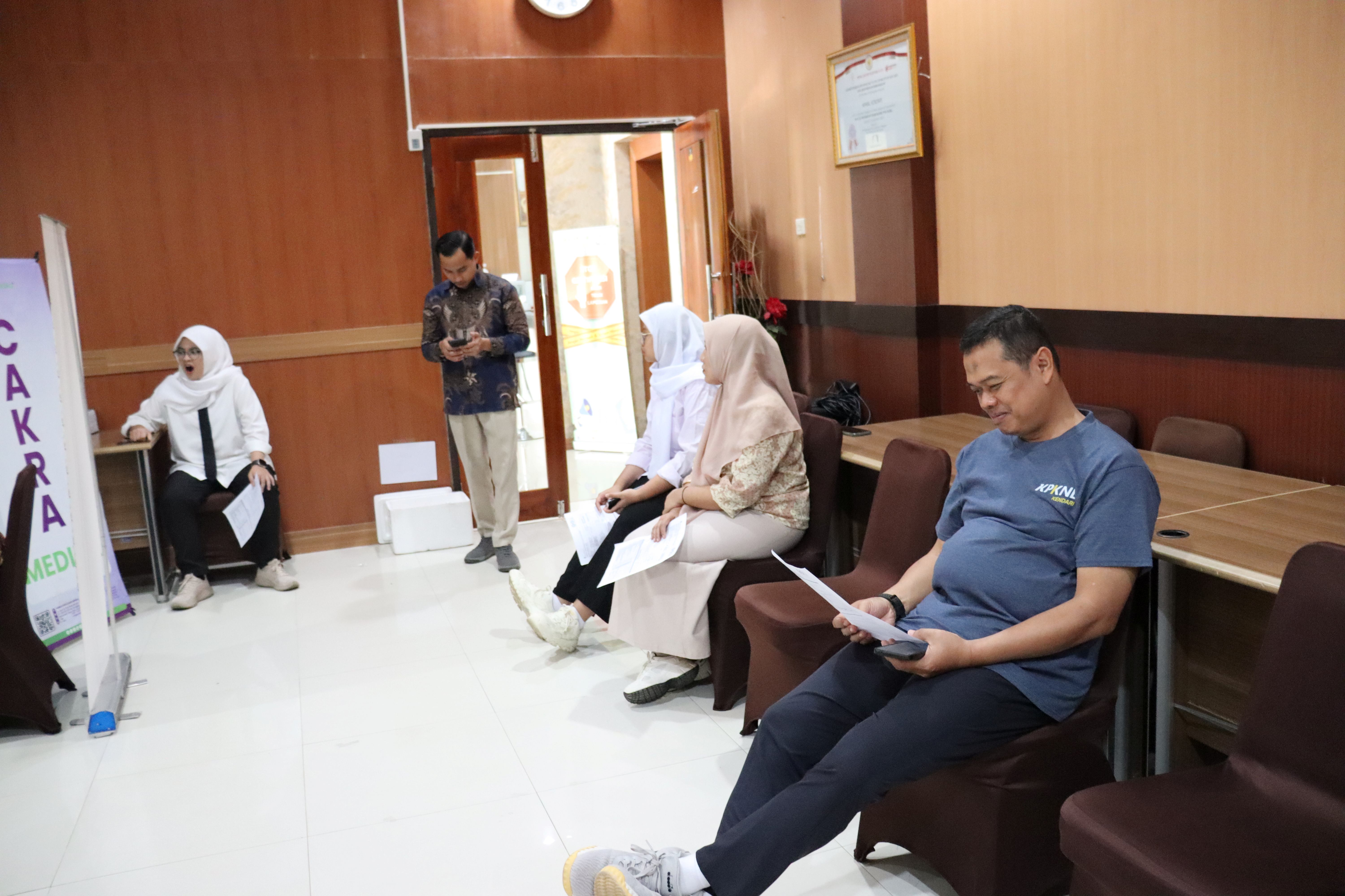 Pelaksanaan kegiatan Medical Check Up (MCU) bagi seluruh pegawai KPKNL Kendari berjalan dengan lancar dan tertib. Kegiatan ini dilaksanakan pada hari Jumat, 24 Oktober 2025, bertempat di Aula KPKNL Kendari, bekerja sama dengan Laboratorium Cakra Medika Kendari. Pemeriksaan dimulai pukul 08.00 WITA dan berlangsung hingga pukul 16.00 WITA. Kegiatan MCU ini diikuti oleh seluruh pegawai KPKNL Kendari, termasuk Pegawai Pemerintah Non Pegawai Negeri (PPNPN) serta petugas keamanan (security). Kepala KPKNL Kendari, Bapak Taufiq Istianto, turut hadir dan mengikuti pemeriksaan kesehatan bersama seluruh pegawai.