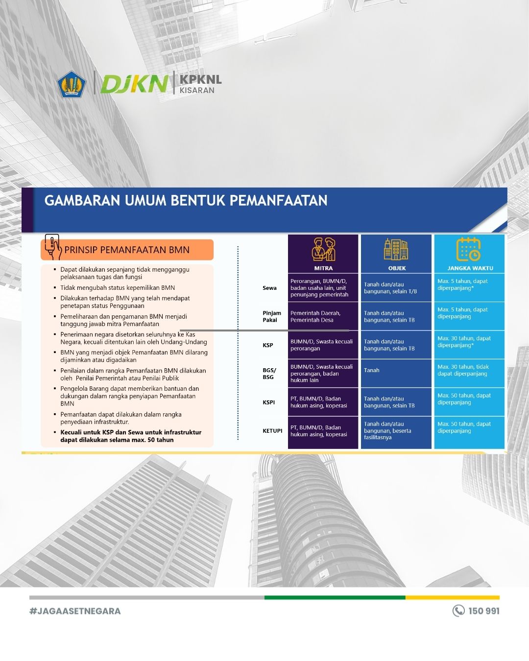 Dalam pemaparannya, dijelaskan bahwa pemanfaatan BMN merupakan bagian dari siklus pengelolaan BMN yang bertujuan mengoptimalkan fungsi aset negara tanpa mengubah status kepemilikannya. Pemanfaatan BMN dilaksanakan dengan menjunjung asas fungsional, kepastian hukum, transparansi, efisiensi, akuntabilitas, dan kepastian nilai, serta didukung oleh regulasi terkini seperti PP Nomor 28 Tahun 2020 dan Perpres Nomor 32 Tahun 2020. Peserta IHT juga memperoleh gambaran umum mengenai enam skema pemanfaatan BMN sesuai PMK 115/PMK.06/2020, yaitu Sewa, Pinjam Pakai, Kerja Sama Pemanfaatan (KSP), Bangun Guna Serah/Bangun Serah Guna (BGS/BSG), Kerja Sama Penyediaan Infrastruktur (KSPI), dan Kerja Sama Terbatas untuk Penyediaan Infrastruktur (KETUPI). Selain itu, disampaikan pula prinsip, tahapan proses, kewajiban mitra, hingga aspek pengamanan dan sanksi administratif dalam pemanfaatan BMN.