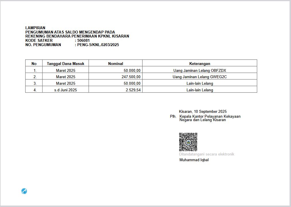 Kantor Pelayanan Kekayaan Negara dan Lelang (KPKNL) Kisaran sebagai instansi yang menangani pengurusan Piutang Negara dan Lelang telah melakukan kegiatan identifikasi, verifikasi, dan konfirmasi atas setoran yang masuk ke rekening Bendahara Penerimaan. Dari hasil kegiatan tersebut ditemukan adanya setoran yang belum teridentifikasi dan/atau dana yang belum diambil oleh pihak yang berhak sebagaimana tercantum dalam daftar terlampir.