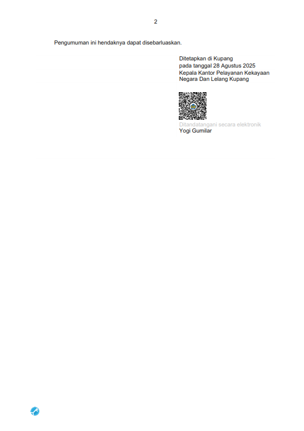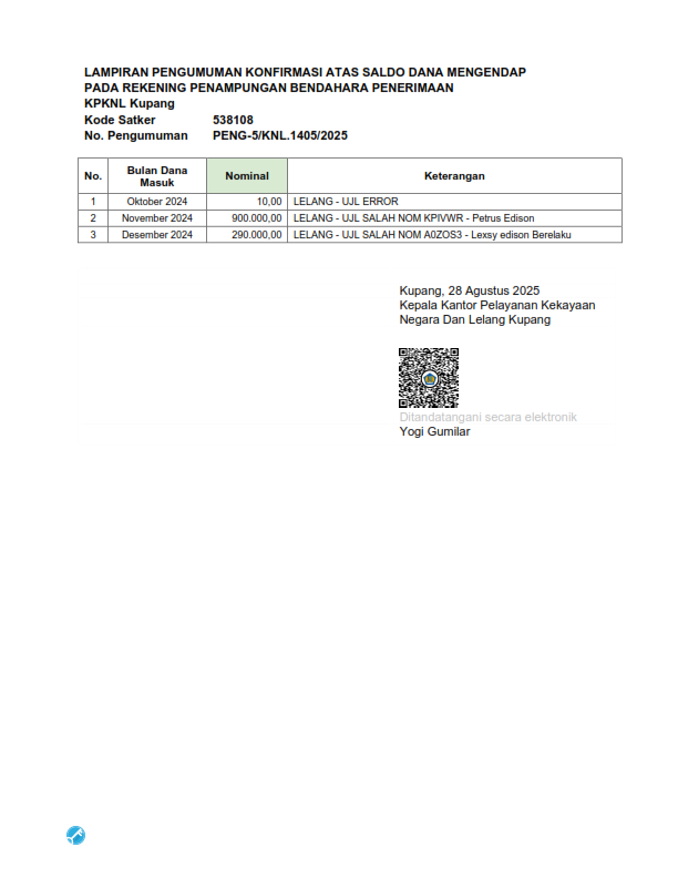 Pengumuman Saldo Dana Mengendap di Rekening Bendahara Penerimaan KPKNL Kupang Per 30 Juni 2025