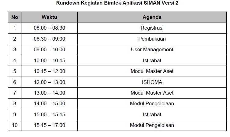 Susunan Acara Kegiatan Bimtek Aplikasi SIMAN v2.