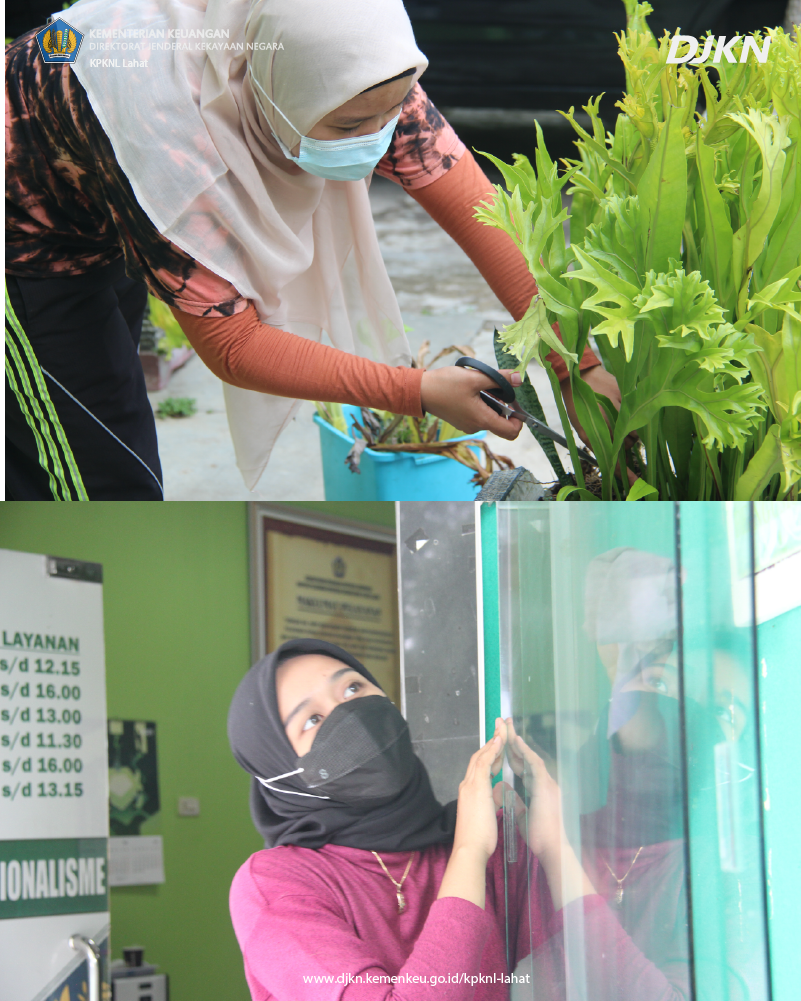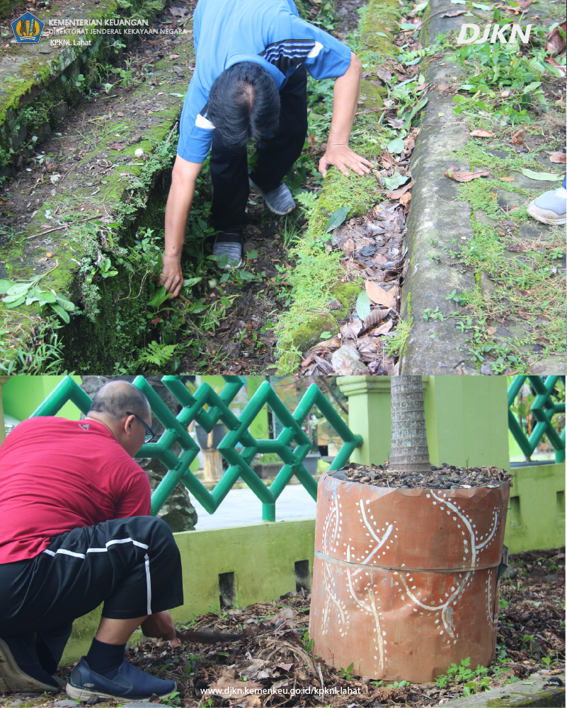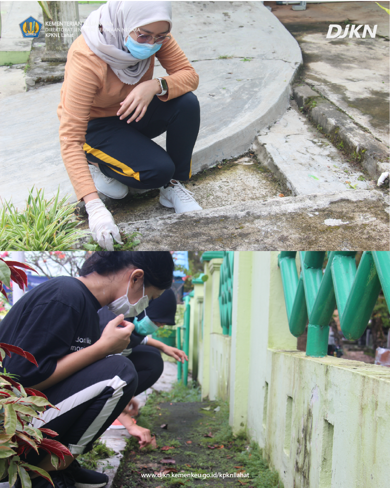 dengan membersihkan halaman kantor, merapikan tanaman yang ada hingga