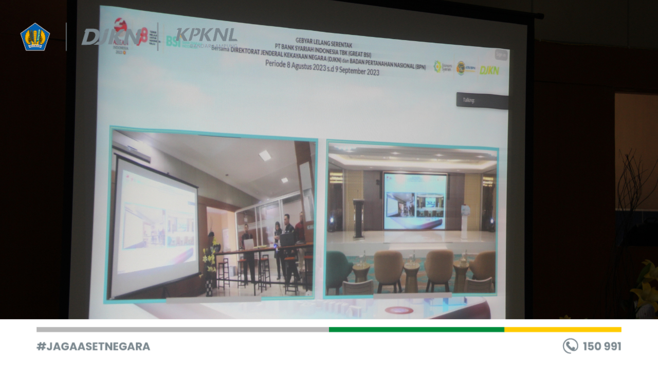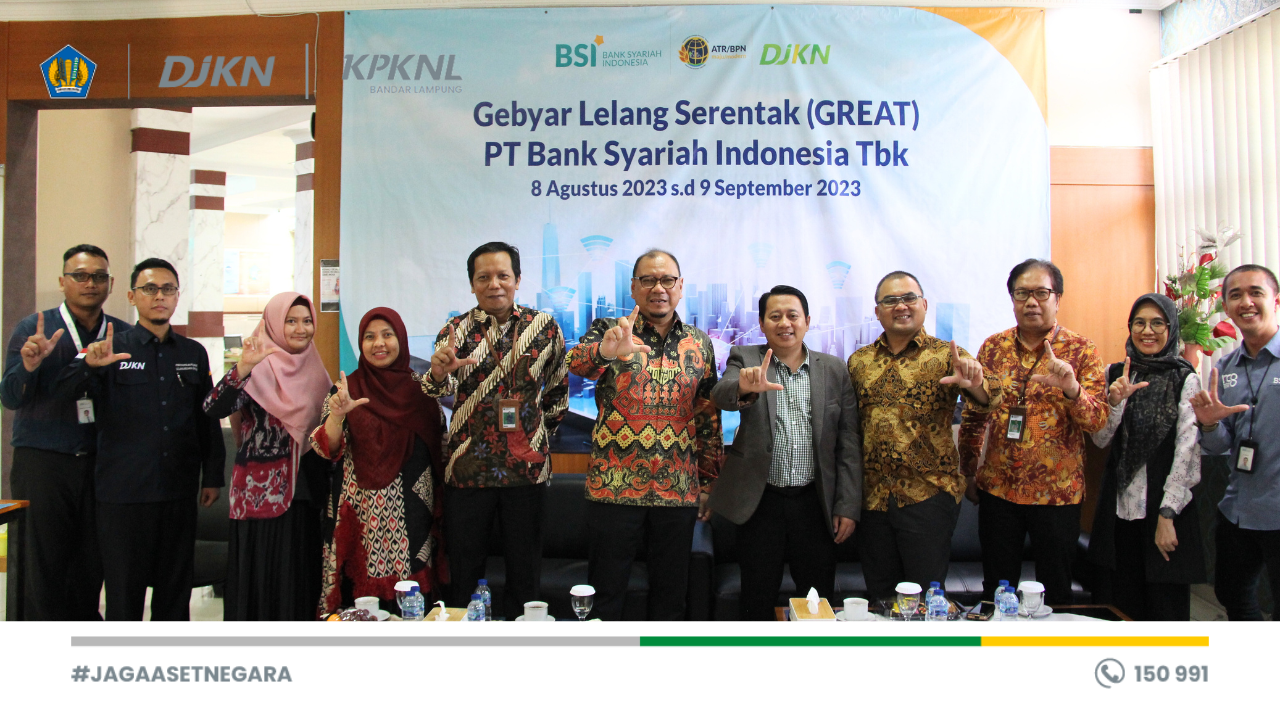 Bandar Lampung - Selasa (08/08) Kantor Pelayanan Kekayaan Negara dan Lelang (KPKNL) Bandar Lampung melaksanakan Lelang Hak Tanggungan PT Bank Syariah Indonesia dalam sebuah rangkaian kegiatan bernama GREAT BSI (Gebyar Lelang Serentak Bank Syariah Indonesia).