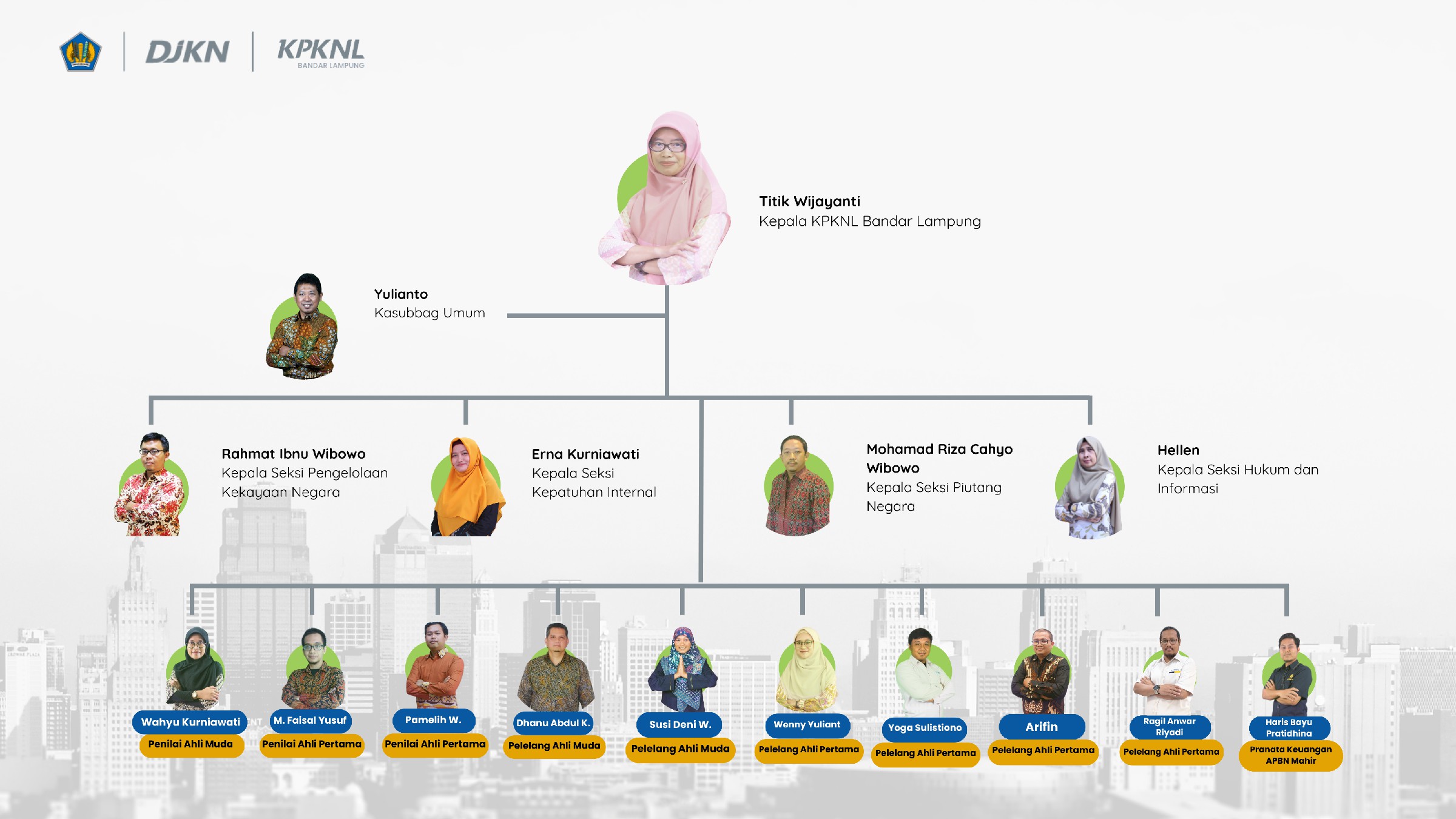Saat ini KPKNL Bandar Lampung dipimpin oleh Kepala Kantor: Titik Wijayanti, yang dibantu oleh Kepala Subbagian Umum: Yulianto, Kepala Seksi Pengelolaan Kekayaan Negara (PKN): Rahmat Ibnu Wibowo, Kepala Seksi Piutang Negara (PN): Mohamad Riza Cahyo Wibowo, Kepala Kepatuhan Internal (KI): Erna Kurniawati, dan Kepala Seksi Hukum dan Informasi (HI): Hellen.