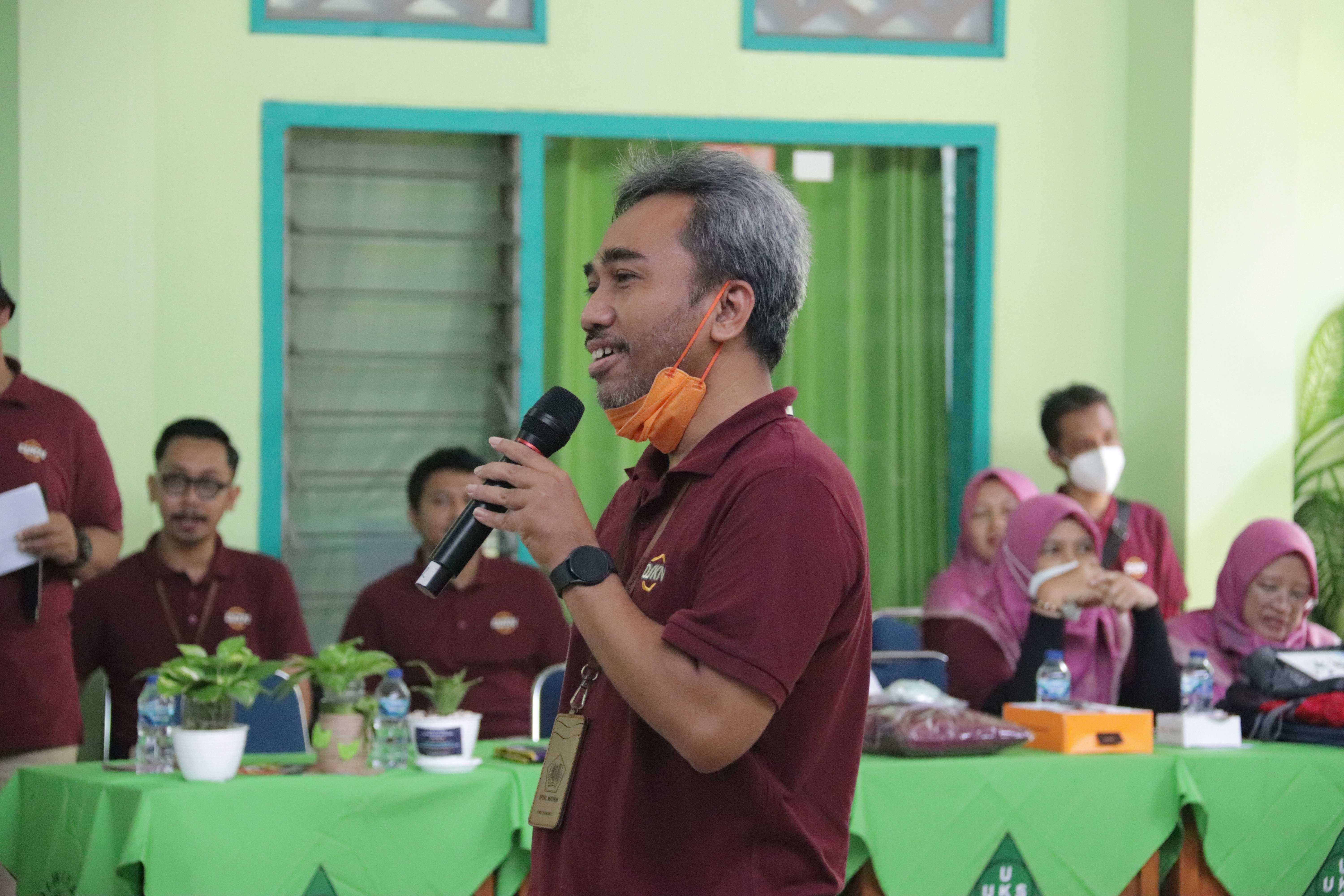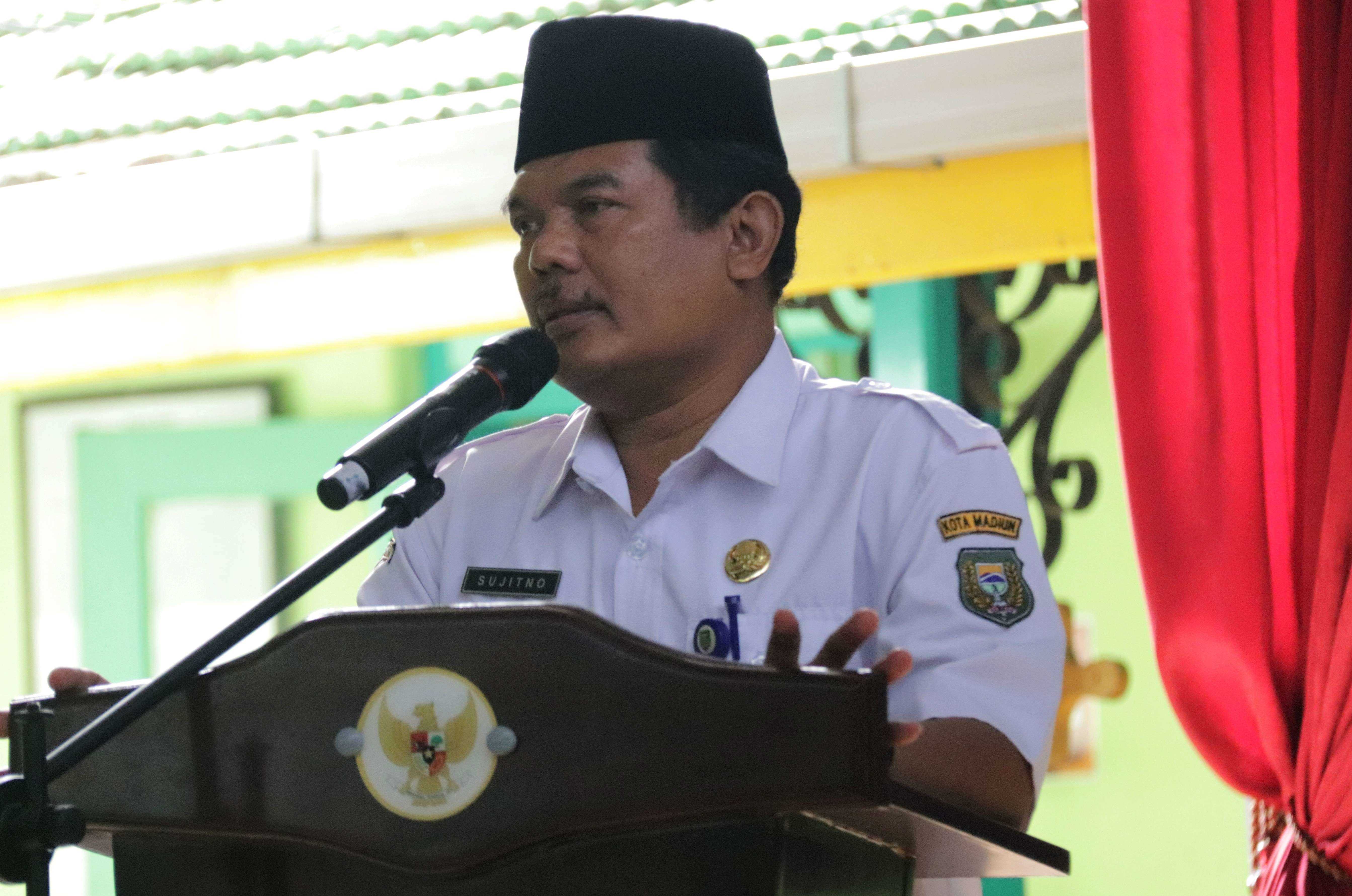 Selanjutnya Kepala SMP Negeri 1 Madiun Sujitno, S.Pd., M.MPd. dalam sambutannya meminta siswa untuk menyimak “Anak-anak, ikuti kegiatan