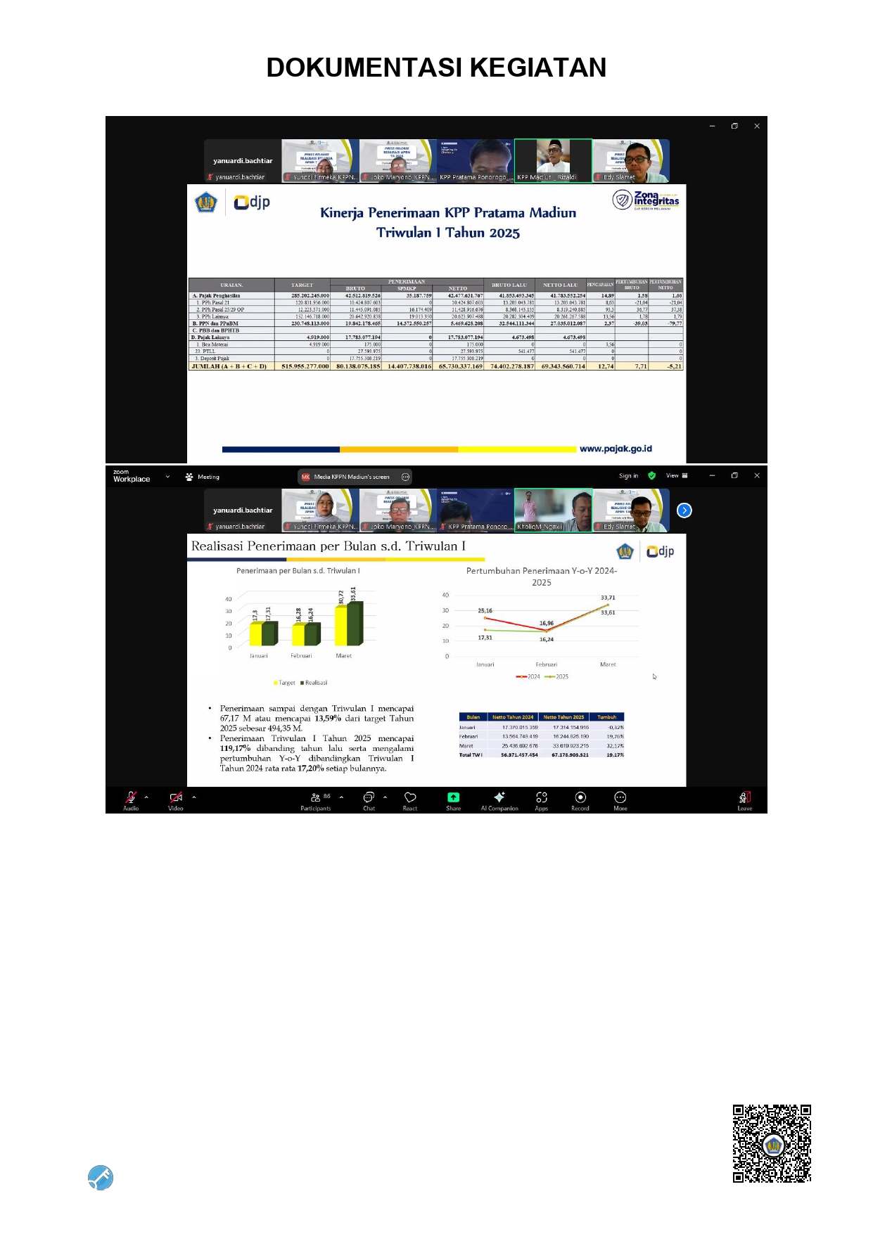 Kemenkeu Satu Lingkup Madiun Raya melaksanakan Press Release Pelaksanaan APBN Triwulan I Tahun Anggaran 2025 Lingkup Madiun Raya, yang dilaksanakan secara online pada Selasa, 22 April 2025, dengan peserta sebanyak 88 (delapan puluh delapan) yang berasal dari para Kuasa Pengguna Anggaran Satuan Kerja Mitra KPPN Madiun dan KPPN Pacitan, Kepala BPKAD Wilayah Madiun Raya, dan Kepala Bappeda Wilayah Madiun Raya (Kota Madiun, Kabupaten Madiun, Kabupaten Ngawi, Kabupaten Magetan, Kabupaten Ponorogo dan Kabupaten Pacitan). Kegiatan tersebut merupakan wujud transparansi informasi terkait capaian/realisasi kinerja pendapatan dan belanja negara di wilayah Madiun Raya secara periodik.
