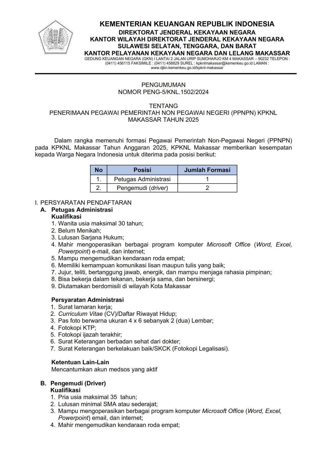 PENERIMAAN PEGAWAI PEMERINTAH NON PEGAWAI NEGERI (PPNPN) KPKNL MAKASSAR TAHUN 2025