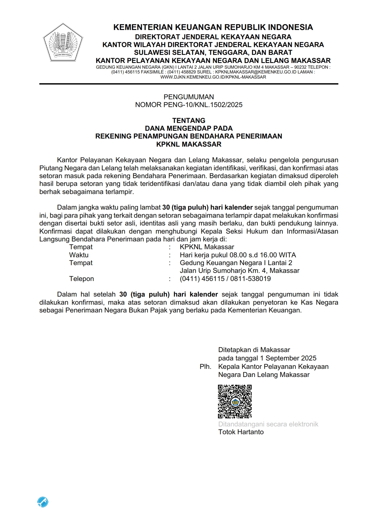 PENGUMUMAN DANA MENGENDAP PADA REKENING PENAMPUNGAN BENDAHARA PENERIMAAN KPKNL MAKASSAR TRIWULAN II TAHUN 2025