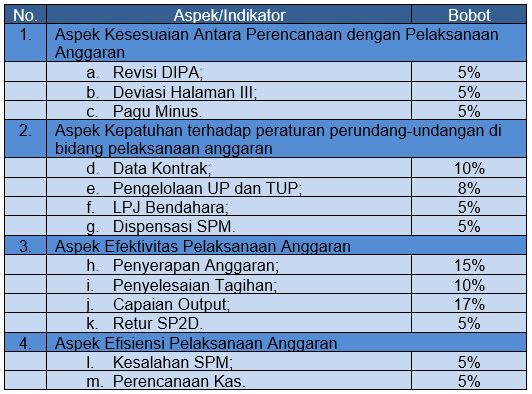 Untuk Tahun 2021, penilaian Indikator Kinerja Pelaksanaan Anggaran diatur dengan Peraturan Direktur Jenderal Perbendaharaan Nomor PER-4/PB/2021 tentang Petunjuk Teknis Penilaian Indikator Kinerja Pelaksanaan Anggaran Belanja Kementerian Negara/Lembaga. Indikator Kinerja Pelaksanaan Anggaran (IKPA) memiliki 4 aspek dan 13 indikator untuk mengukur kinerja pelaksanaan anggaran, yaitu: