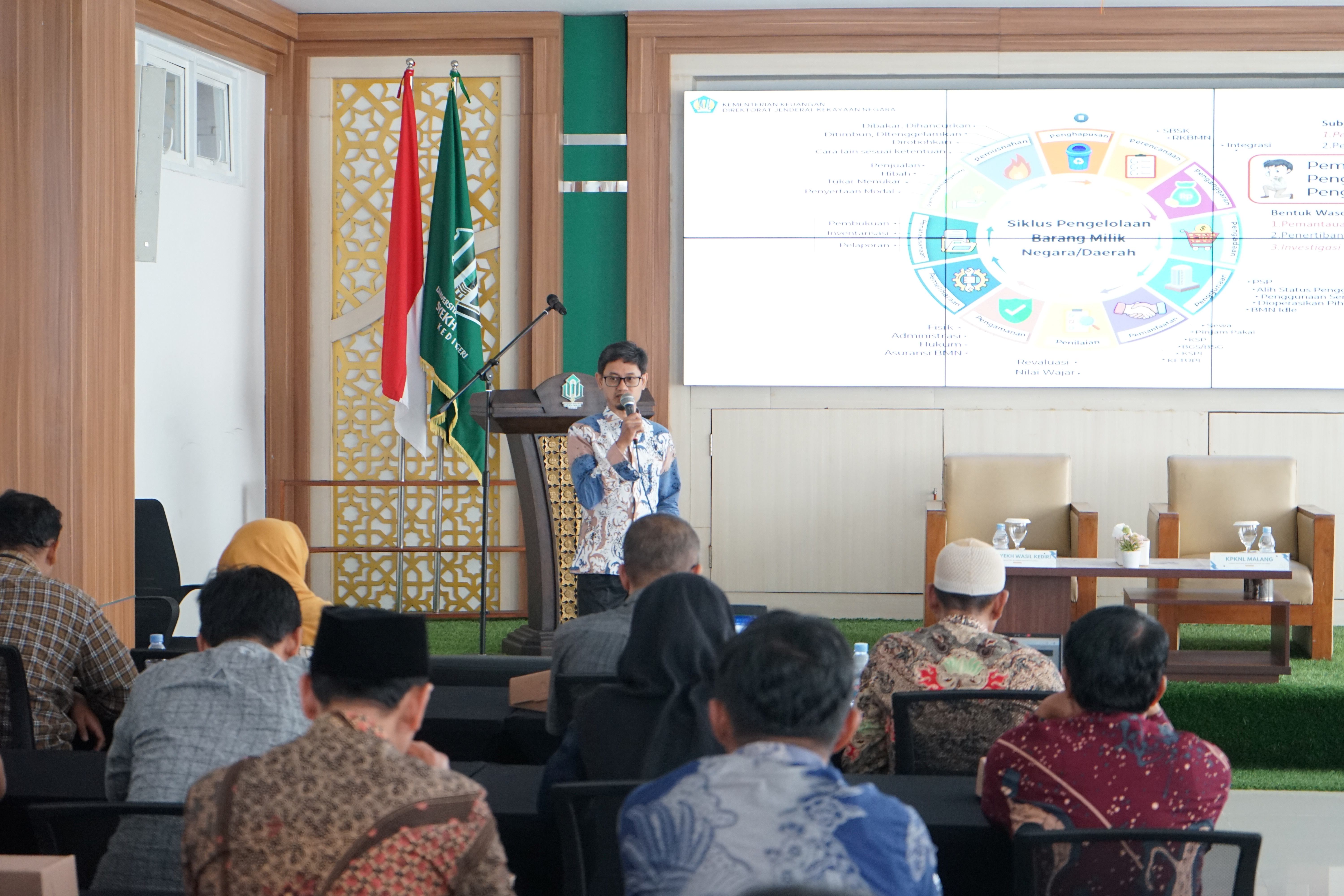 Kantor Pelayanan Kekayaan Negara dan Lelang (KPKNL) Malang menggelar kegiatan Sosialisasi Layanan yang bertempat di Universitas Islam Negeri (UIN) Syekh Wasil Kediri pada Kamis, 2 April 2026. Acara ini dihadiri oleh berbagai stakeholder di wilayah Kediri dan sekitarnya, yang tidak hanya berasal dari lingkungan Kementerian Agama, tetapi juga instansi pemerintah lainnya. Rektor UIN Kediri, Prof. Dr. H. Wahidul Anam, M.Ag., membuka acara secara resmi dengan memberikan apresiasi atas inisiatif KPKNL Malang dalam memberikan edukasi tata kelola aset negara. Pada sesi utama, Kepala KPKNL Malang, Kurniawan Catur Andrianto, memberikan pemaparan menyeluruh mengenai profil layanan instansi sekaligus menekankan komitmen bersama melalui Sosialisasi Anti Korupsi dan Anti Gratifikasi guna mewujudkan budaya kerja yang bersih dan berintegritas.