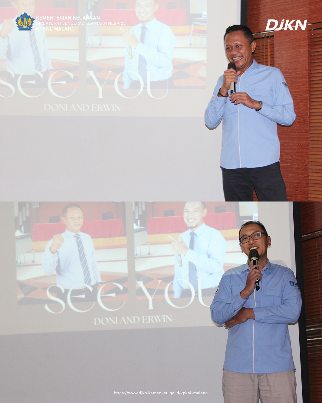 pada Rabu, 5 Oktober 2022 bertempat di Aula lantai 2, KPKNL Malang melepas dua pegawai terbaiknya yang selanjutnya akan bertugas di tempat yang baru. Doni Ardiansyah Pejabat Fungsional Pelelang Ahli Muda akan bertugas di KPKNL Mataram. Sedangkan Erwin Endrabawana, Pejabat Fungsional Pelelang Ahli Pertama akan bertugas di KPKNL Denpasar. Doni dan Erwin ditugaskan di tempat yang baru berdasarkan Surat Keputusan Menteri Keuangan Republik Indonesia nomor KMK 148/KM.6/2022 Tentang Pemindahan Pejabat Fungsional Pelelang di Lingkungan Direktorat Jenderal Kekayaan Negara.