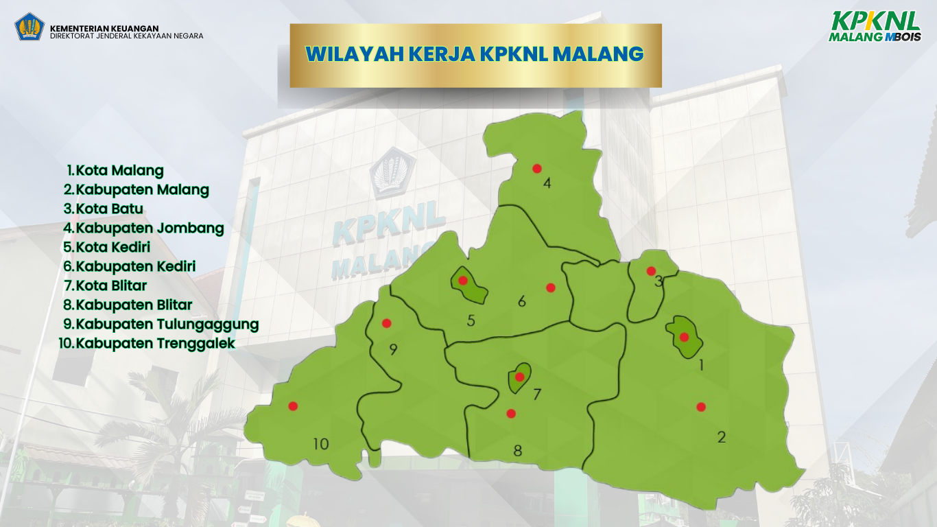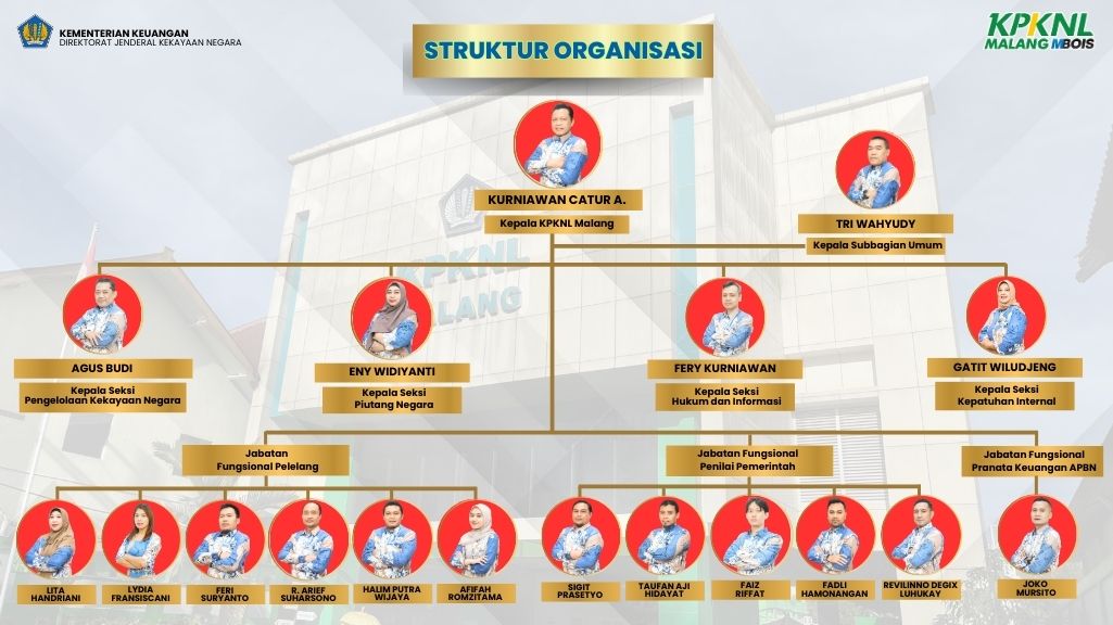 Kantor Pelayanan Kekayaan Negara dan Lelang (KPKNL) Malangmerupakan instansi vertikal unit eselon III yang berada di bawah dan bertanggung jawab langsung kepada Kepala Kantor Wilayah DJKN Jawa Timur. Sesuai Peraturan Menteri Keuangan Nomor 154/PMK.01/2021 tentang Organisasi dan Tata Kerja Instansi Vertikal Direktorat Jenderal Kekayaan Negara, KPKNL Malangmempunyai tugas melaksanakan pelayanan di bidang kekayaan negara, penilaian, dan lelang.