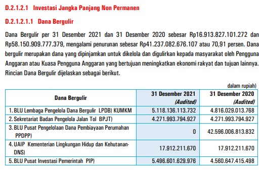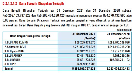 Dalam susunan Neraca Laporan Keuangan Pemerintah Pusat, piutang negara khususnya yang telah diserahkan kepada PUPN, masuk kedalam beberapa akun diantaranya adalah Investasi Jangka Panjang Non Permanen (D.2.1.2.1). Sebagai contoh pada LKPP 2021 audited, Akun Dana Bergulir (D.2.1.2.1.1) milik BLU LPDB KUMKM sebesar Rp5.118.136.113.732,- dengan pos Dana Bergulir Diragukan Tertagih (D.2.1.2.1.2) sebesar Rp808.205.473.670,-. Berikut adalah tangkapan layar dari LKPP Audited 2021.