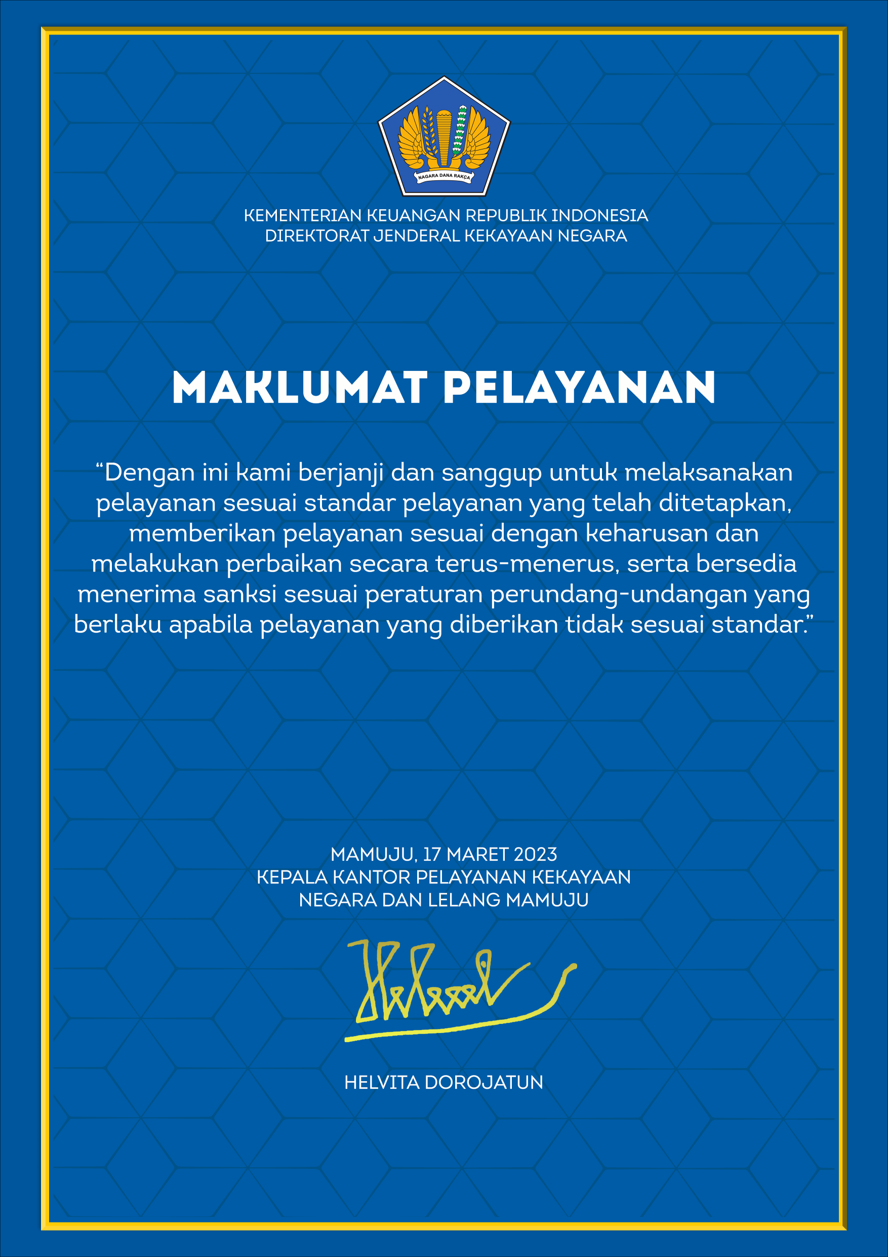 KPKNL Mamuju selalu berkomitmen untuk memberilan pelayanan yang terbaik kepada Pengguna Jasa. Berikut Maklumat Pelayanan KPKNL Mamuju: