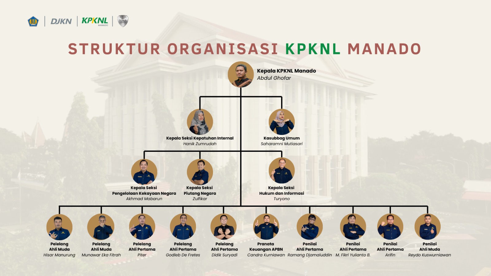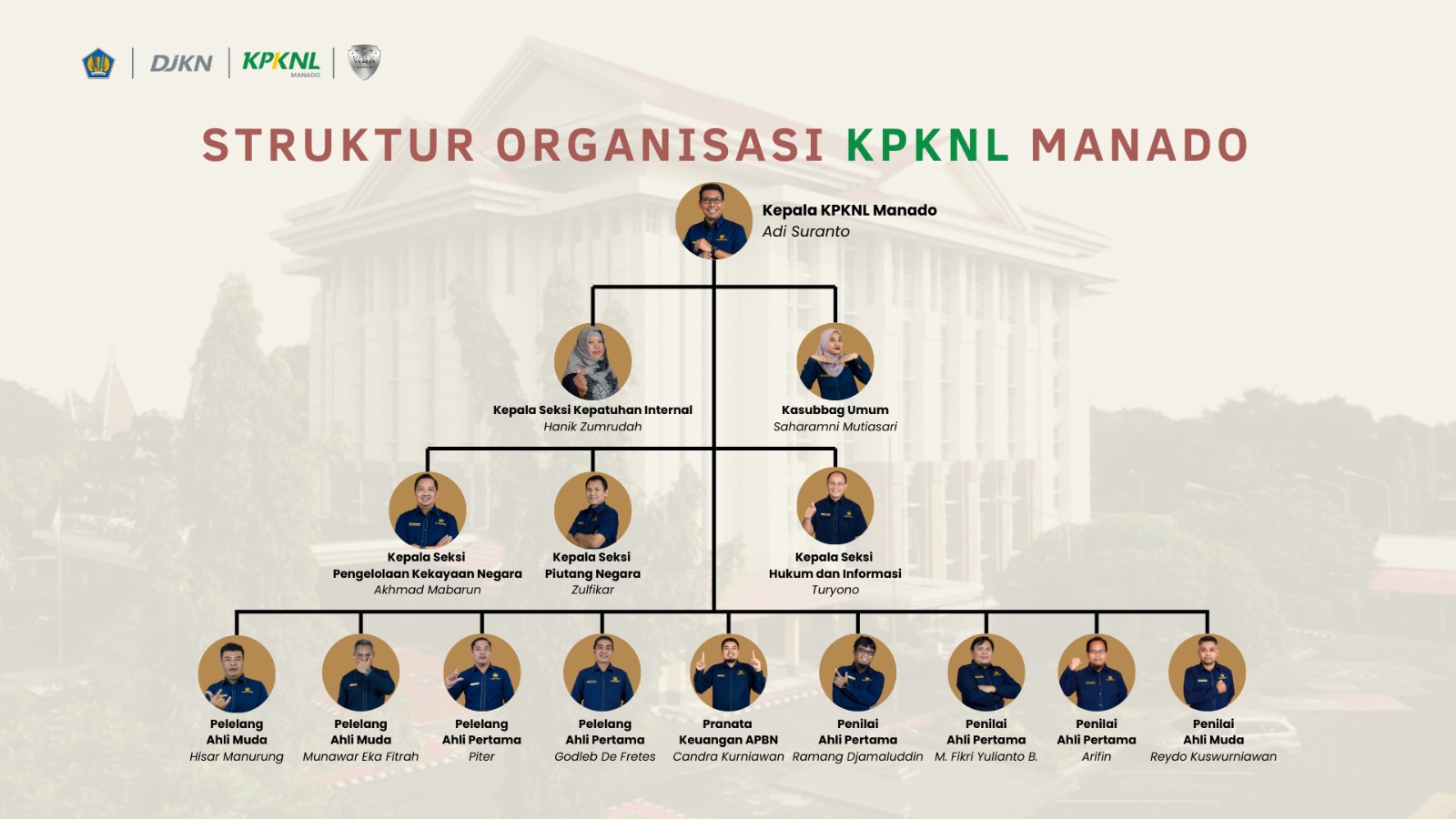 KPKNL Manado dipimpin oleh Adi Suranto, S.H, M.Ec.Dev. selaku Kepala Kantor sejak Juni 2023. Dalam menjalankan tugasnya, Kepala Kantor dibantu oleh 1 (satu) Subbagian Umum, 4 (empat) Kepala Seksi dan 9 (sembilan) Pejabat Fungsional. Untuk menunjang kelancaran operasional dan pelayanan kepada masyarakat, KPKNL Manado juga didukung oleh 14 pegawai pelaksana dan 7 pegawai pemerintah non-pegawai negeri (PPNPN). Adapun struktur organisasi KPKNL Manado sebagai berikut: