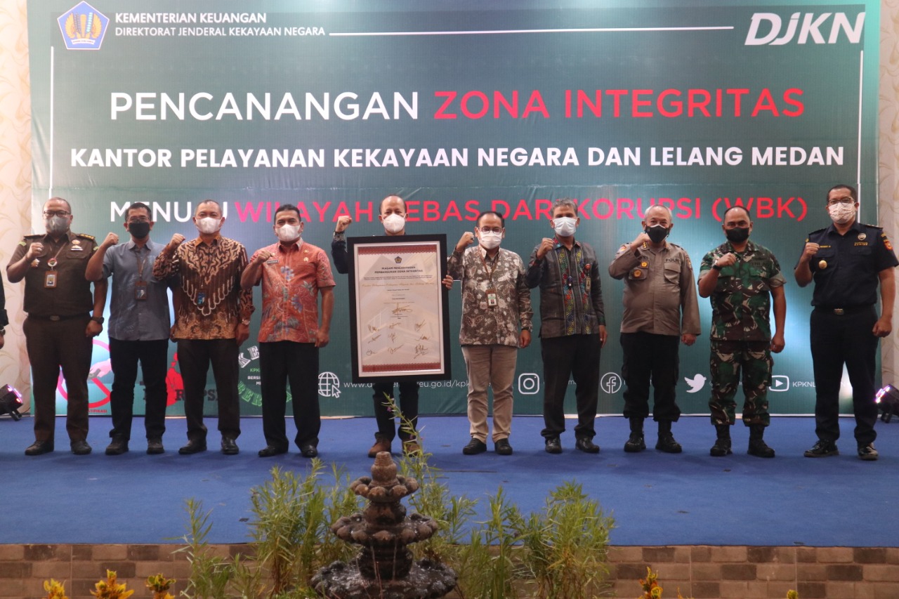 Penandatanganan Piagam Pencanangan Pembangunan Zona Integritas oleh Kepala KPKNL Medan sekaligus meresmikan Pencangan Pembangunan Zona Integritas menuju Wilayah Bebas dari Korupsi pada KPKNL Medan dengan saksi antara lain Kepala Kanwil DJKN Sumatera Utara,Tedy Syandriadi, Kepala Ombudsman RI Perwakilan Sumatera Utara, Abyadi Siregar, Kepala BPKAD Kota Medan, Zulkarnain, Kepala Biro Perencanaan dan Anggaran Polda Sumut, Kombespol Harries Bidiharto, Kepala Zidam I/ Bukit Barisan Letkol Czi Yudil Hendro, SMEC Head Regional Office BRI Medan, Ayatna Anang Widodo, Pimpinan BNI Remedial and Recovery Wilayah Medan, Prima Junaidi, Jaksa Madya dari Kejaksaan Tinggi Sumatera Utara, Mirza Erwinsyah, dan Kepala Seksi KPTA Kanwil DJBC Sumut, Juan Girsang.