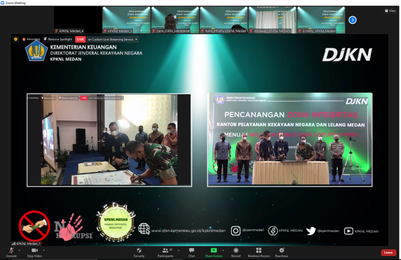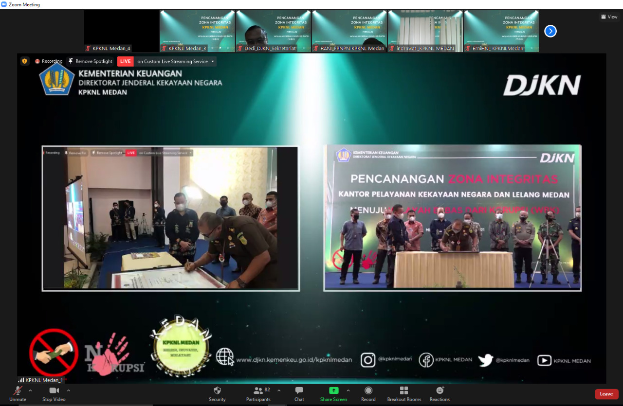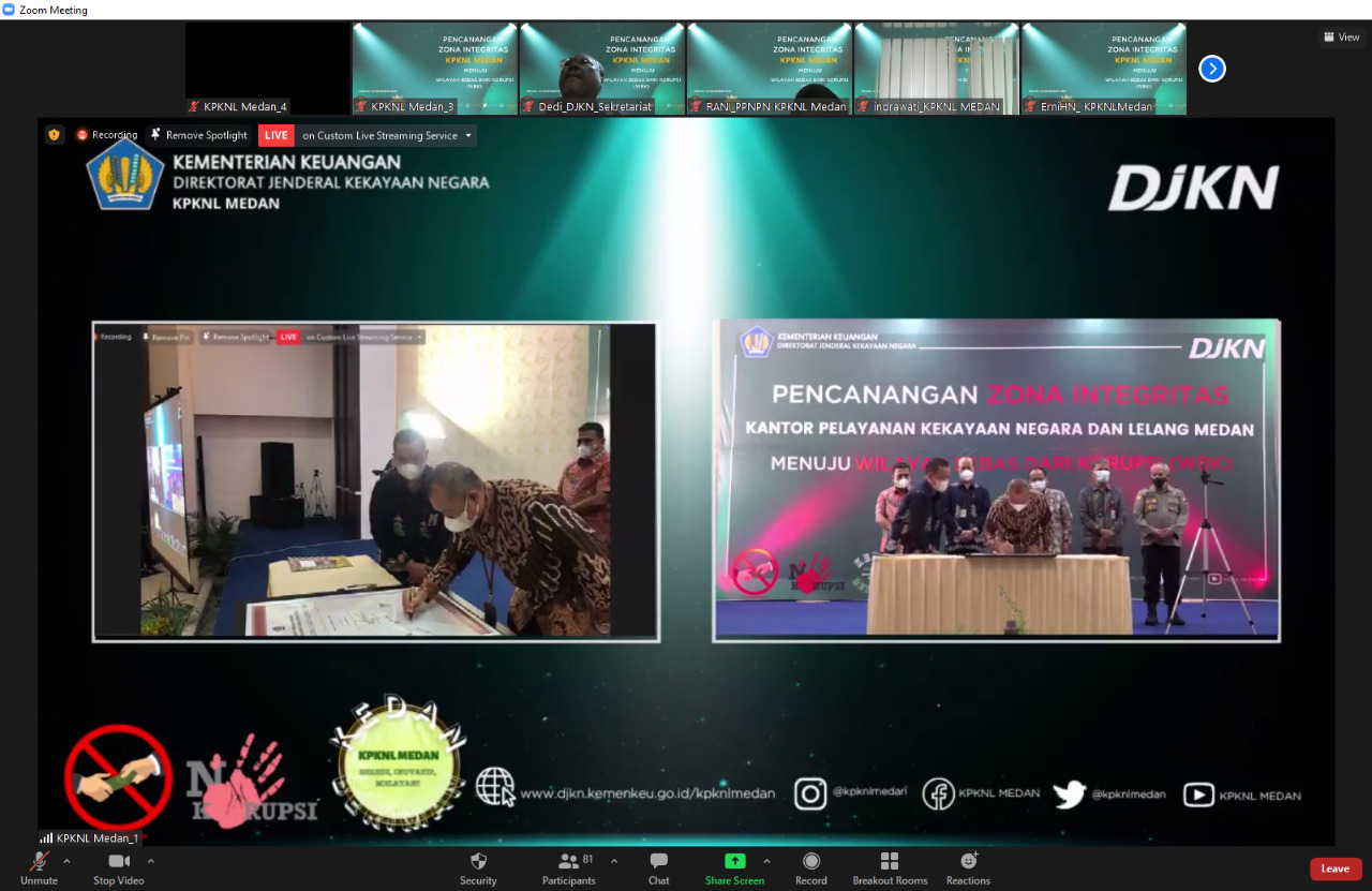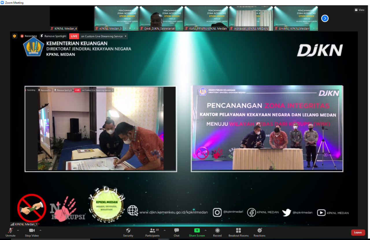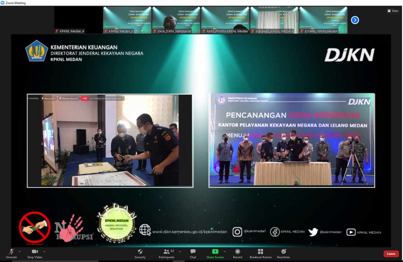 Pencanangan Zona Integritas (ZI) ini dilaksanakan secara hybrid, melalui live zoom meeting dan kanal youtube KPKNL Medan. Dalam pelaksanaan acara tetap memperhatikan protokol kesehatan, yaitu memakai masker, menjaga jarak, dan dilakukan pengecekan suhu sebelum masuk ke ruang acara.