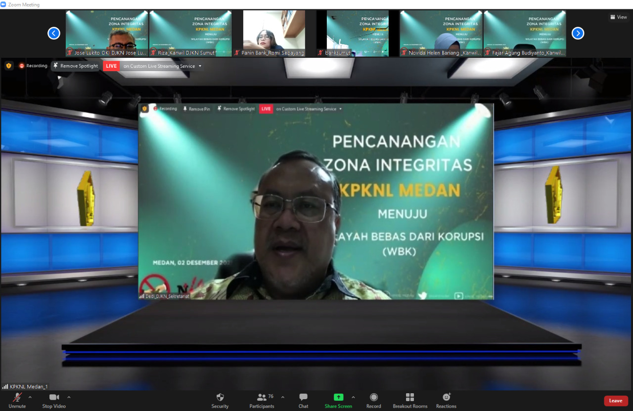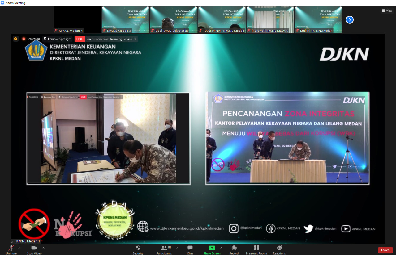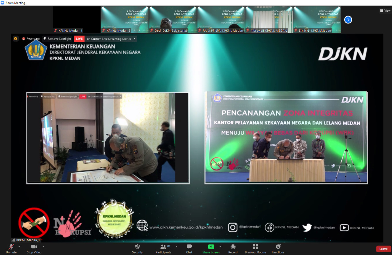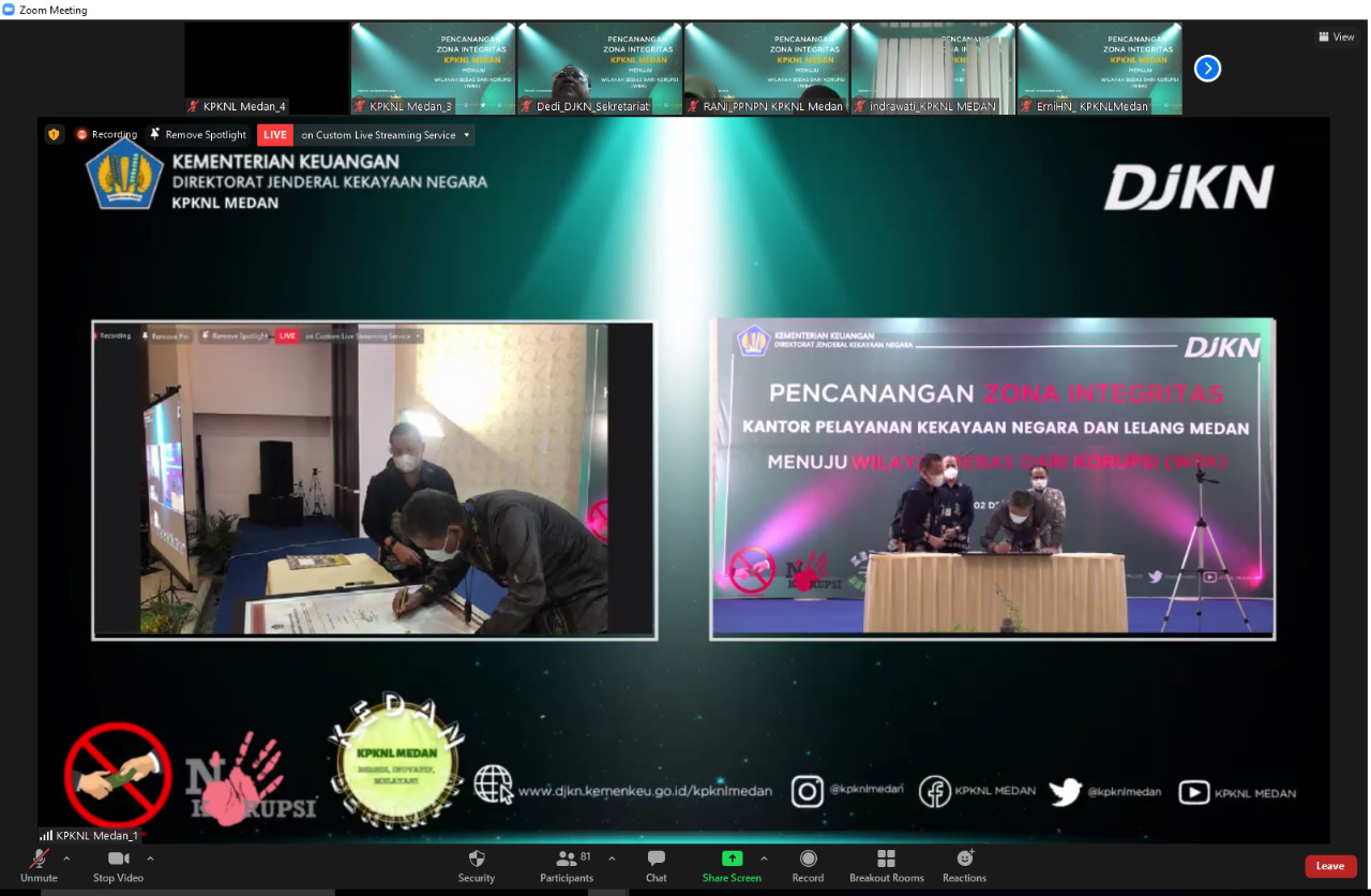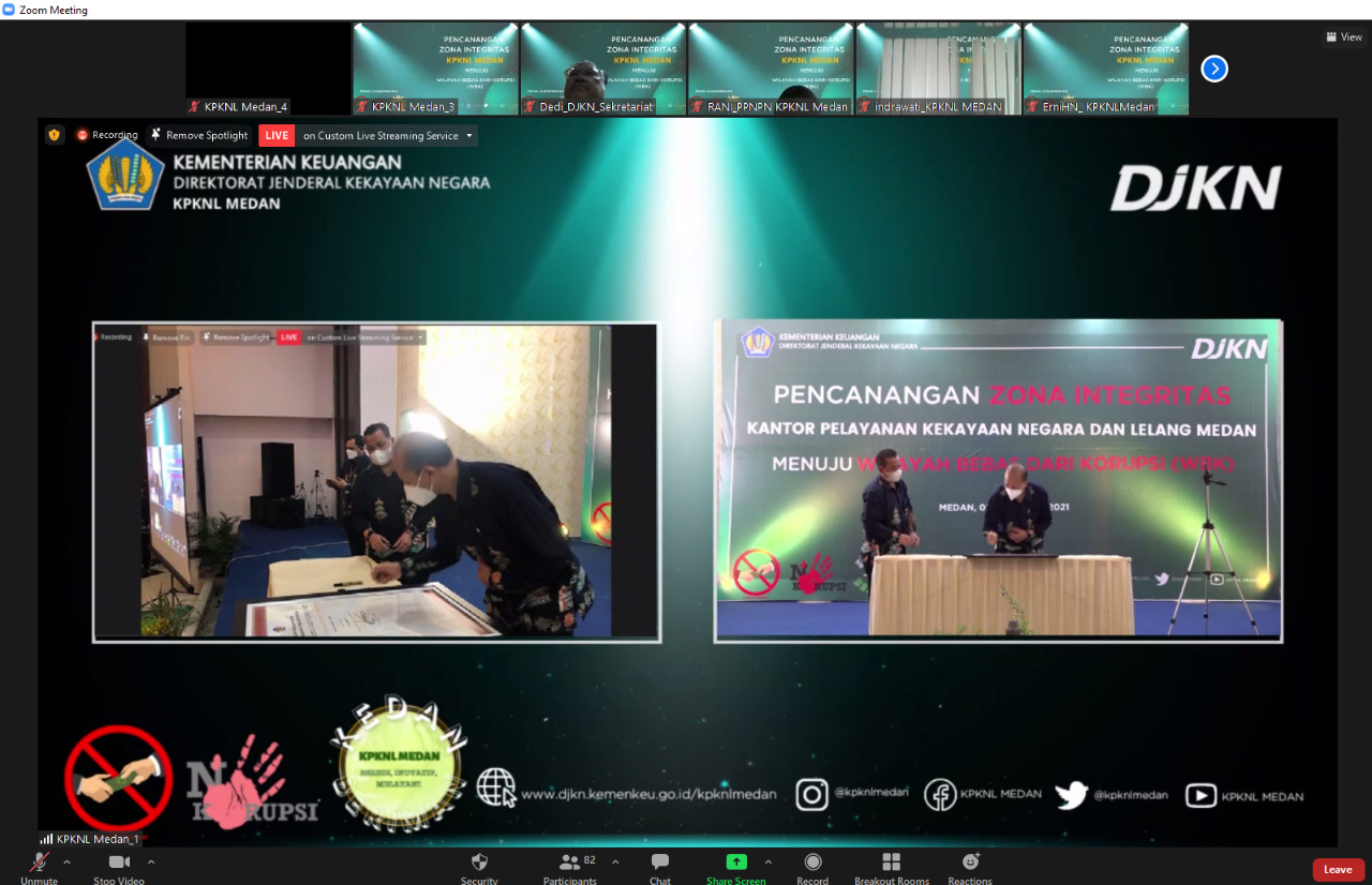 Pencanangan Zona Integritas (ZI) ini dilaksanakan secara hybrid, melalui live zoom meeting dan kanal youtube KPKNL Medan. Dalam pelaksanaan acara tetap memperhatikan protokol kesehatan, yaitu memakai masker, menjaga jarak, dan dilakukan pengecekan suhu sebelum masuk ke ruang acara.