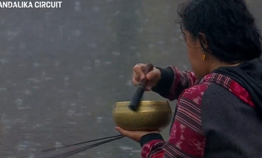 perempuan paruh baya yang sedang berjalan mengelilingi perlintasan balapan sambil memukul-mukul sebuah wadah seperti mangkok emas di tengah derasnya