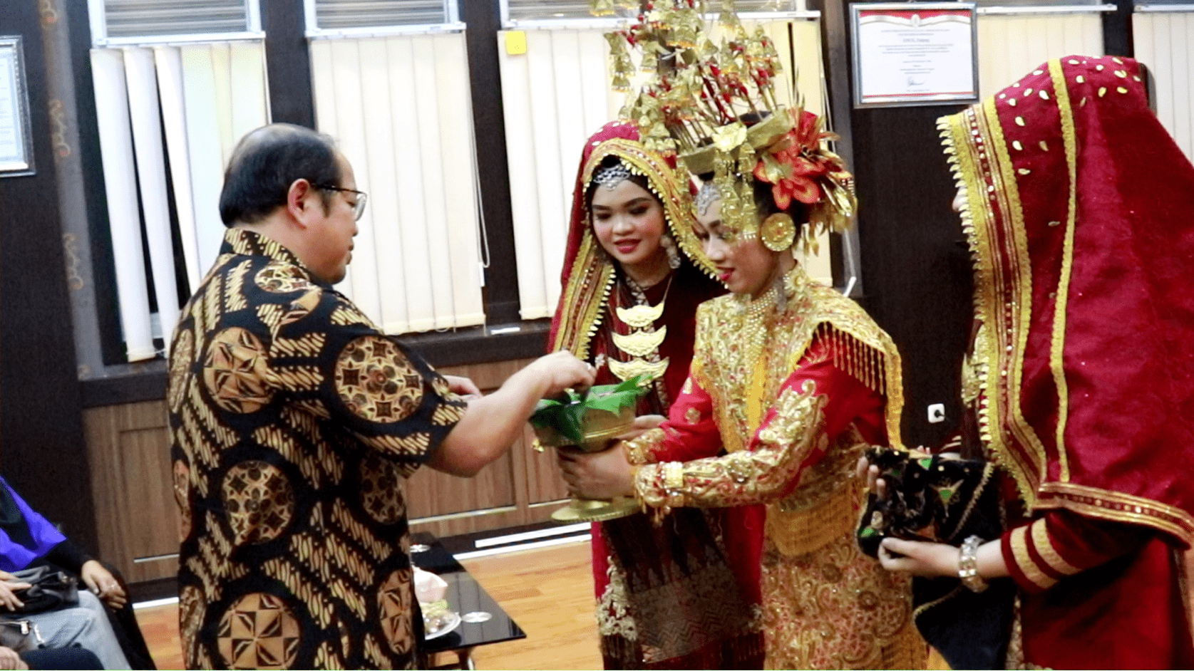 menyuguhkan sirih sebagai pemuliaan tamu dan pemberian deta, yaitu topi adat
