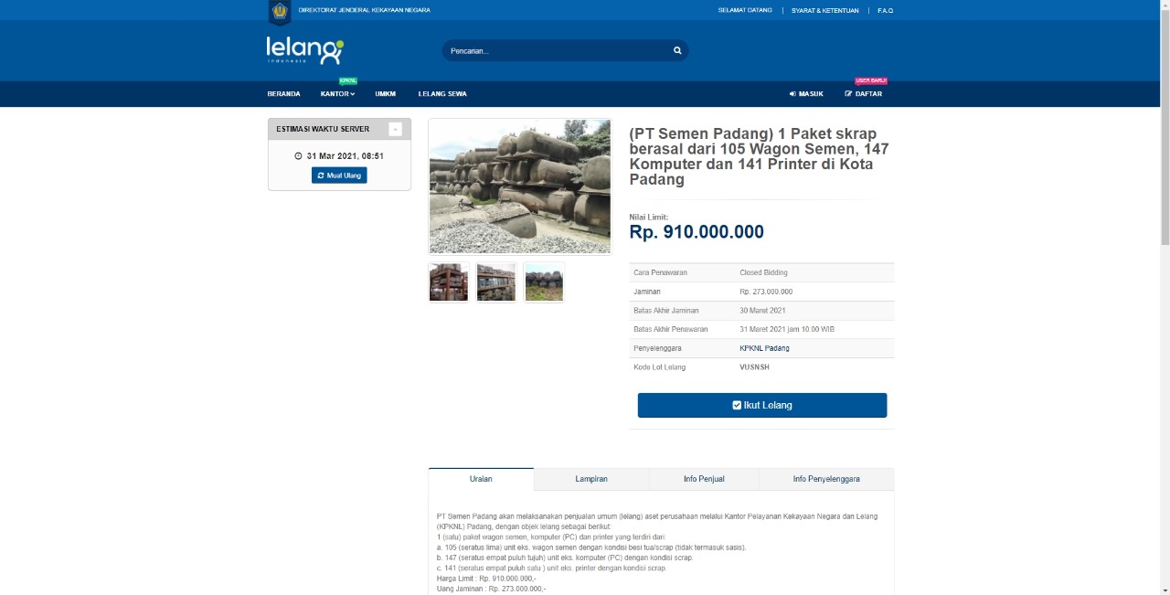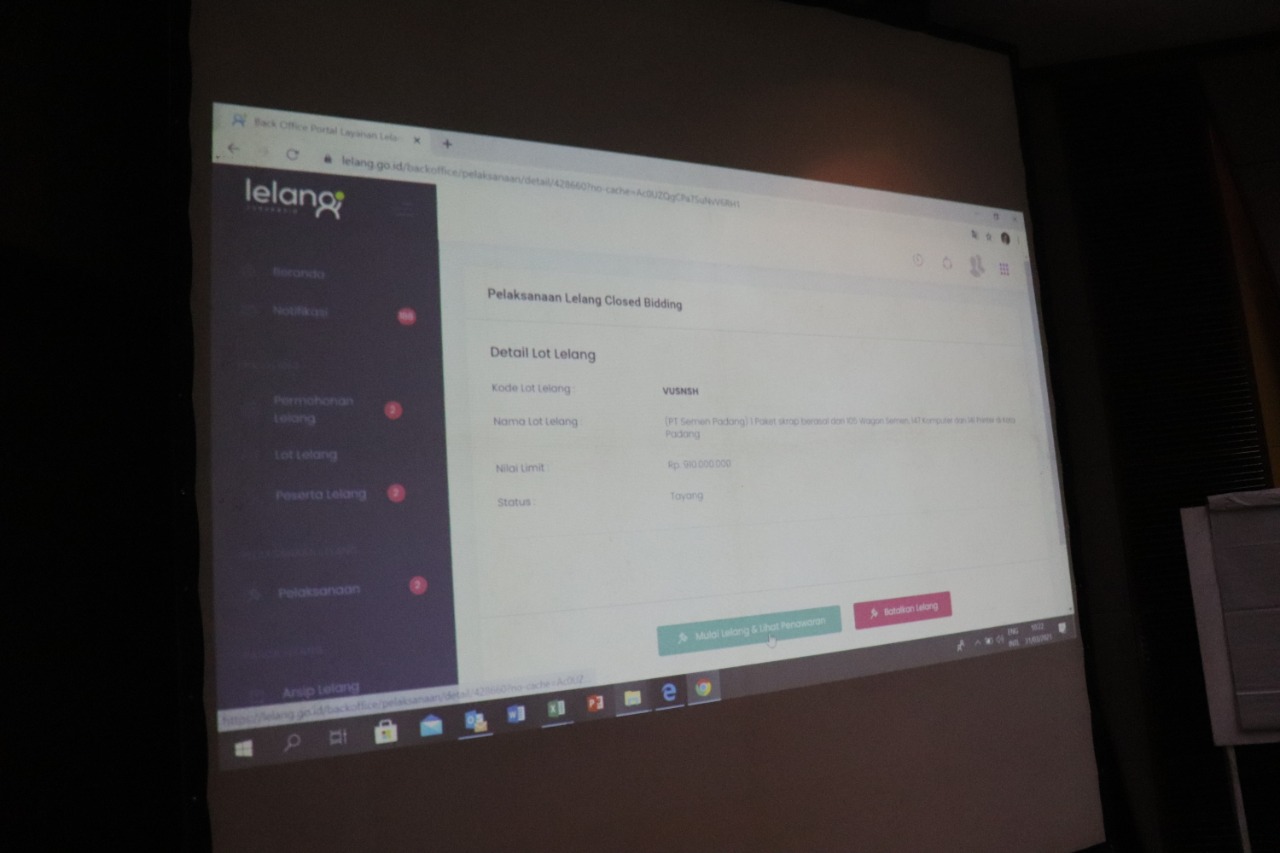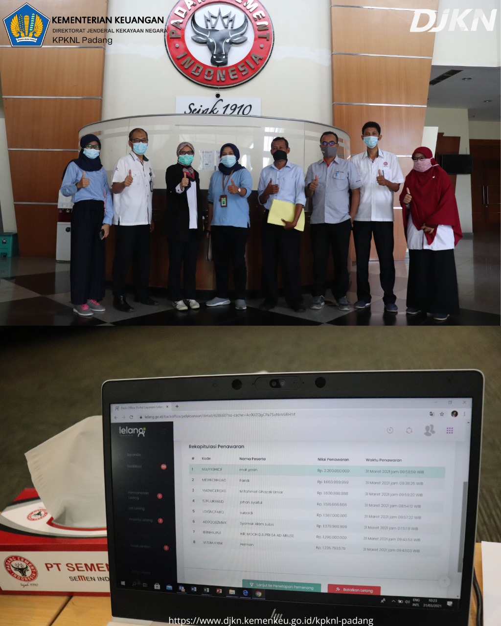 Padang - Lelang (e-Auction) aset perusahaan Milik PT Semen Padang yang dilakukan oleh Kantor Pelayanan Kekayaan Negara dan Lelang (KPKNL) Padang digelar di Gedung Utama PT. Semen Padang pada hari Rabu tanggal 31 Maret 2021. Pelaksanaan lelang dipimpin oleh Pelelang Ahli Pertama KPKNL Padang, Santi Safaria dan bertindak sebagai Pejabat Penjual Nurita Handayani (Kepala Unit Sarana Umum PT Semen Padang). Lelang dilaksanakan dengan penawaran secara tertulis tanpa kehadiran peserta lelang melalui aplikasi portal lelang Indonesia (closed bidding) yang dapat diakses pada alamat domain https://lelang.go.id. Tepat pukul 10.00 waktu server Aplikasi Lelang Indonesia, Santi Safaria mengetuk palu menentukan pemenang pada pelaksanaan lelang ini.