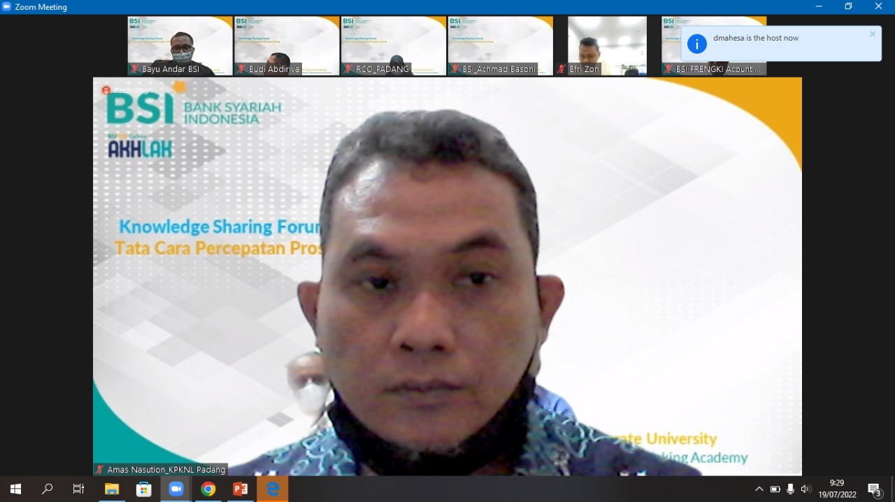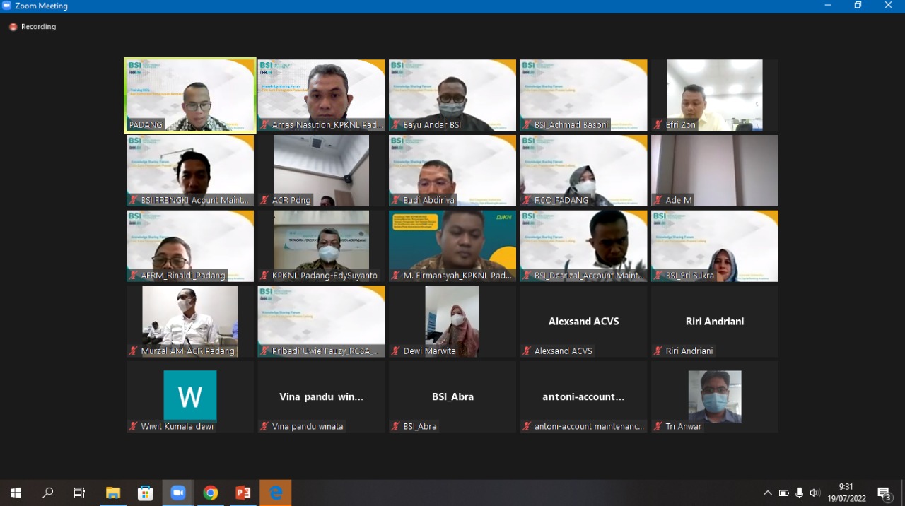 Selasa (19/7), Kolaborasi apik antara KPKNL Padang dengan Bank Syariah Indonesia (BSI) tergambar dalam pelaksanaan Knowledge Sharing Forum (KSF) yang bertemakan Tata Cara Percepatan proses lelang di BSI ACR Padang.