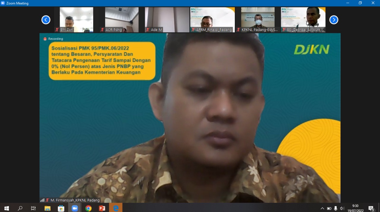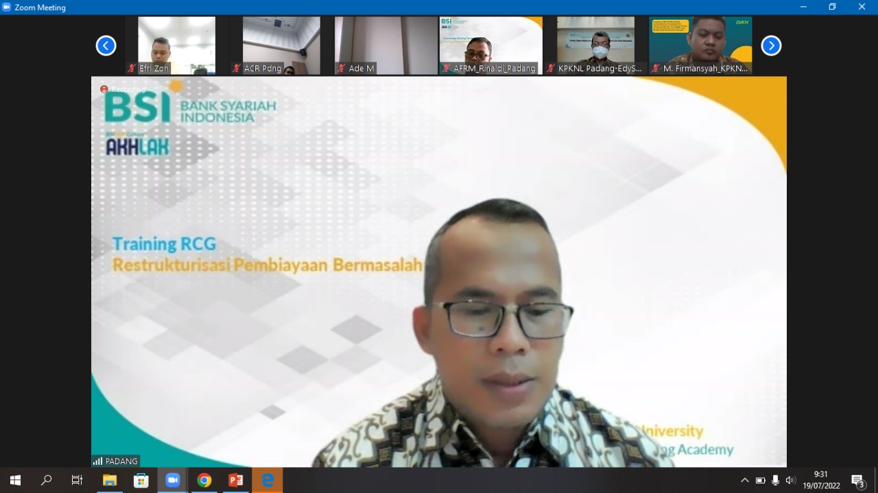 Acara tersebut dilaksanakan secara Hybrid (online dan offline) menggunakan Aplikasi Zoom Metting. Adapun Audiensi yang hadir adalah Tim Recovery Aset PT Bank Syariah Indonesia Cabang Padang. Dalam sabutannya Area Manager Bank Syariah Indonesia Padang, Budi Abdiriva menyampaikan Apresiasi dan terima kasih kepada KPKNL Padang atas kerjasamanya selama ini khususnya terkait pelayanan lelang. Sebagai salah satu upaya PT Bank Syariah Indonesia dalam penyelesaian permasalahan kredit, maka dilakukan penjualan Agunan melalui lelang, tentunya tidak terlepas dengan kerjasama yang baik dengan rekan-rekan KPKNL Padang.