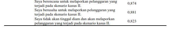 Hasil pengujian hipotesis penelitian ini dapat dilihat pada Tabel 3. Nilai adjusted R2 sebesar 0,165 menunjukkan bahwa variabel intensi pelaporan pelanggaran dipengaruhi oleh variabel sistem pelaporan pelanggaran, keadilan organisasional (KO), dan kepuasan kerja (KK) sebesar 16,5 persen dan sisanya 83,5 persen dipengaruhi oleh variabel lain di luar model penelitian ini.
