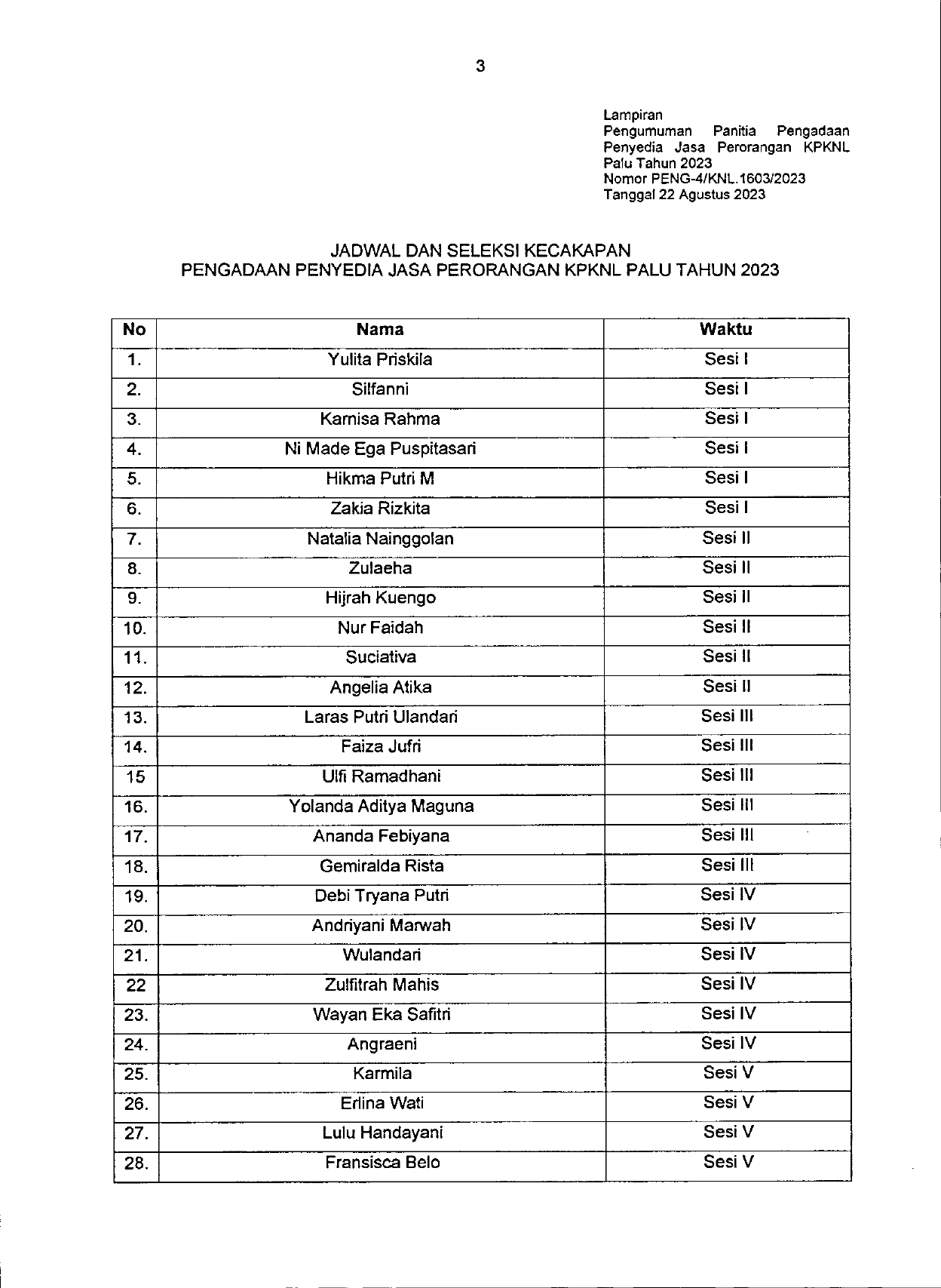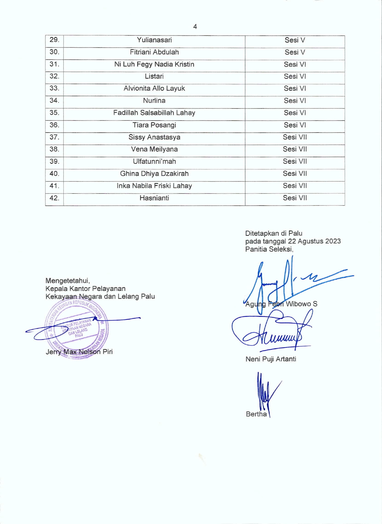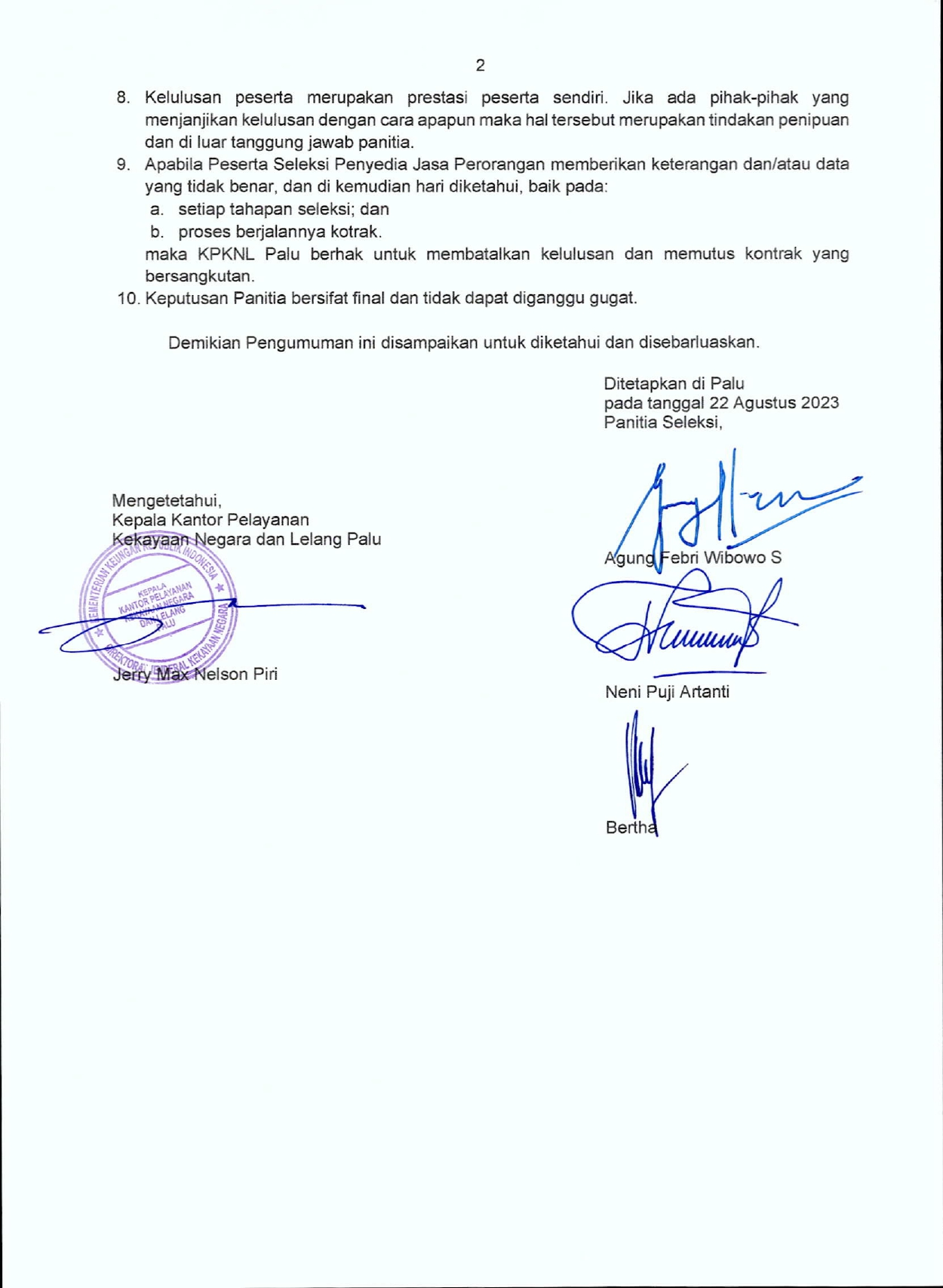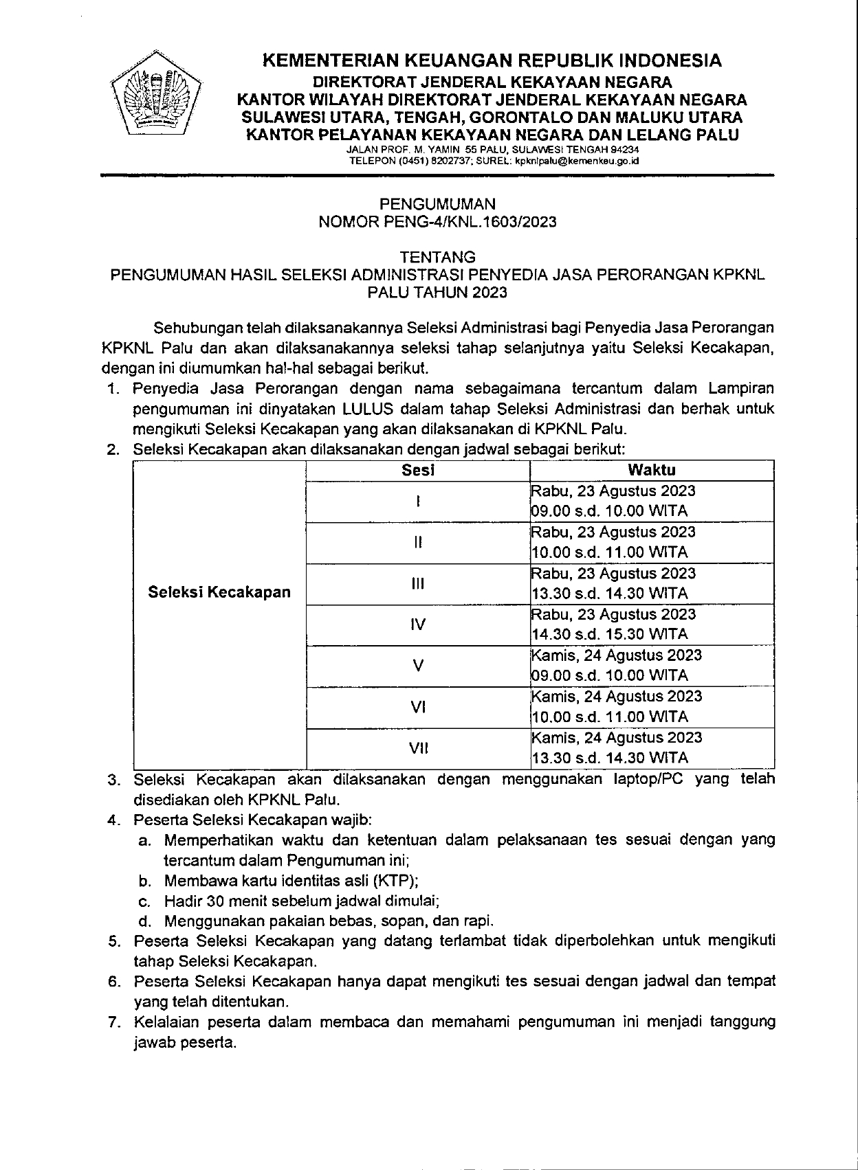 Pengumuman Hasil Seleksi Administrasi Rekrutmen Petugas Front Office KPKNL Palu