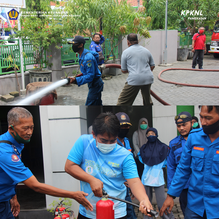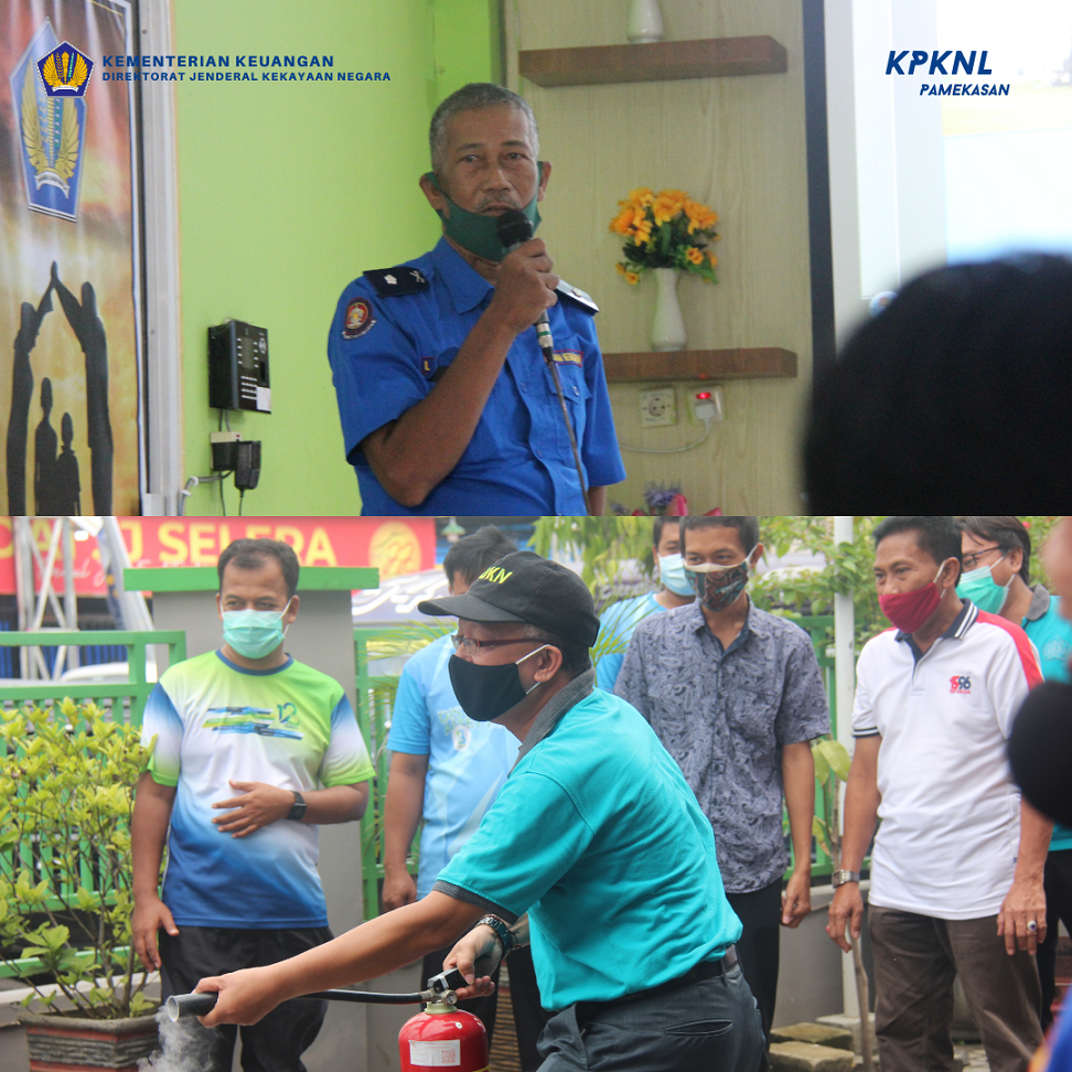 Setelah sosialisasi dilaksanakan, seluruh pegawai dan tenaga honorer KPKNL Pamekasan diajak untuk melakukan simulasi pemadaman api, satu per satu pegawai/tenaga honorer mencoba memadamkan api menggunakan kain basah dan alat pemadam api.
