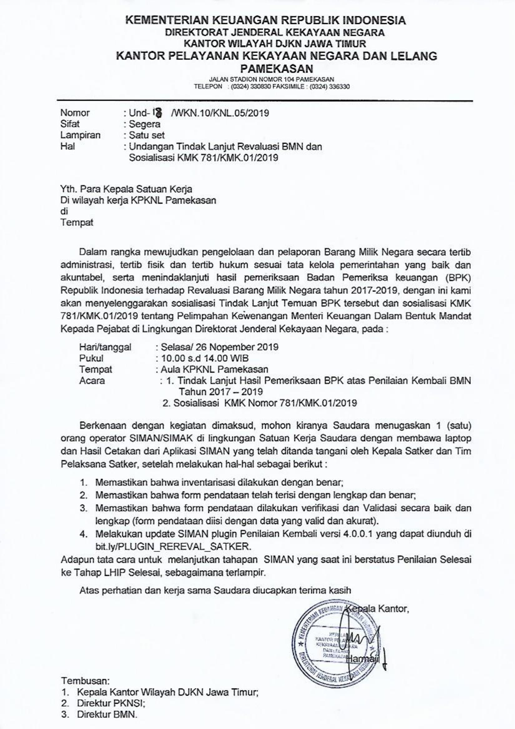 Undangan Tindak Lanjut Revaluasi BMN dan Sosialisasi KMK 781/KMK.01/2019