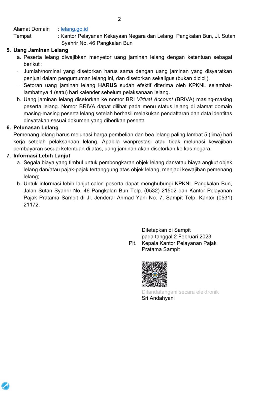 Arin menambahkan, objek yang dilelang dalam kondisi fisik apa adanya (as is), peserta lelang dapat melihat objek lelang sejak adanya pengumuman. Objek lelang dapat di lihat di KPP Pratama Sampit, Jalan Jenderal Ahmad Yani Nomor 7, Sampit.