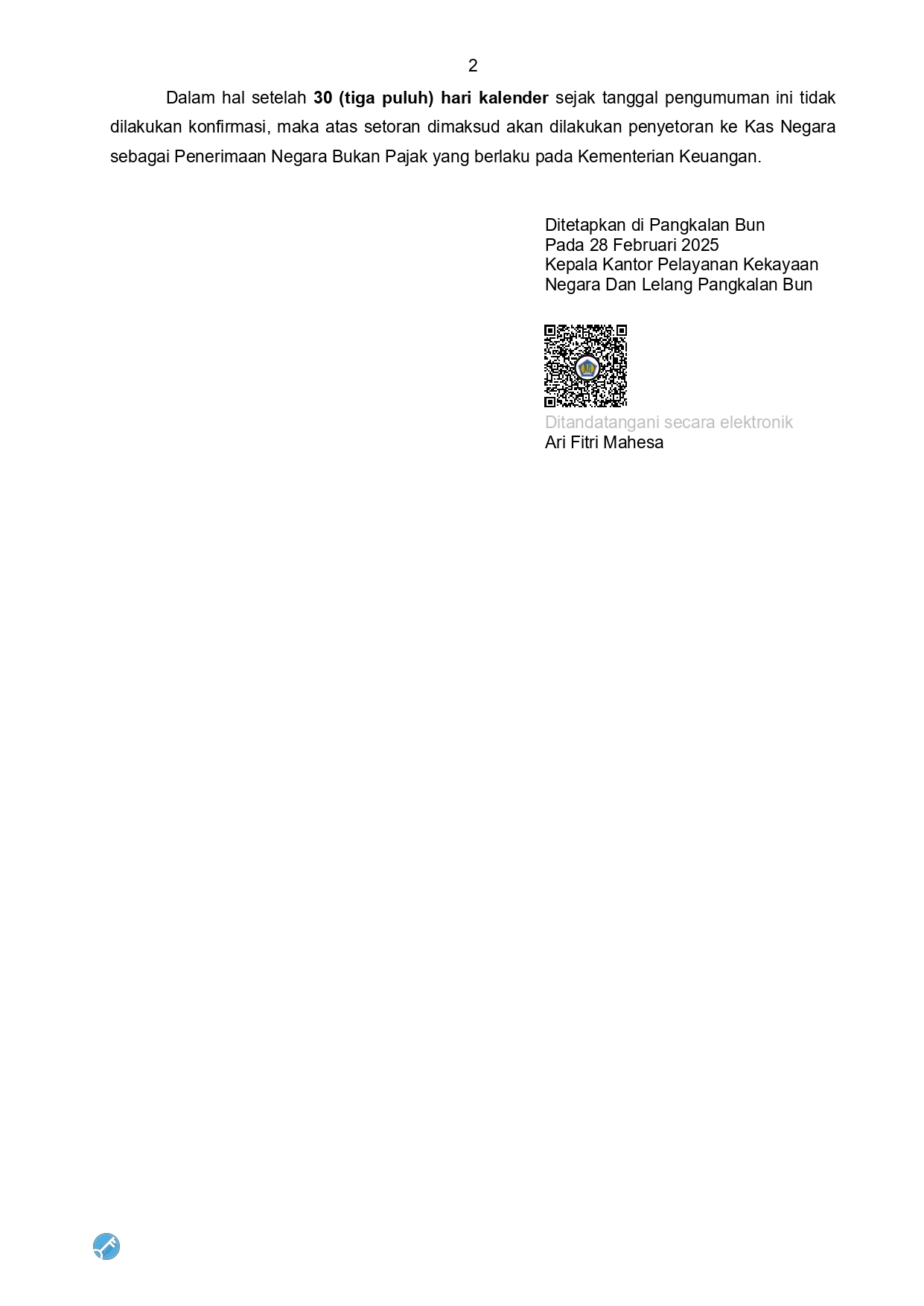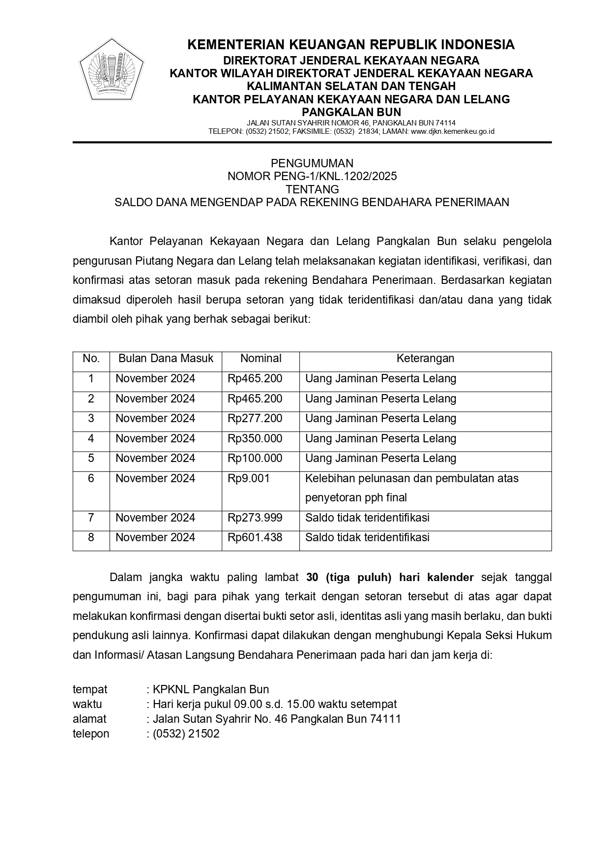 Pengumuman Konfirmasi atas Saldo Bendahara Penerimaan pada Rekening Penampungan KPKNL Pangkalan Bun