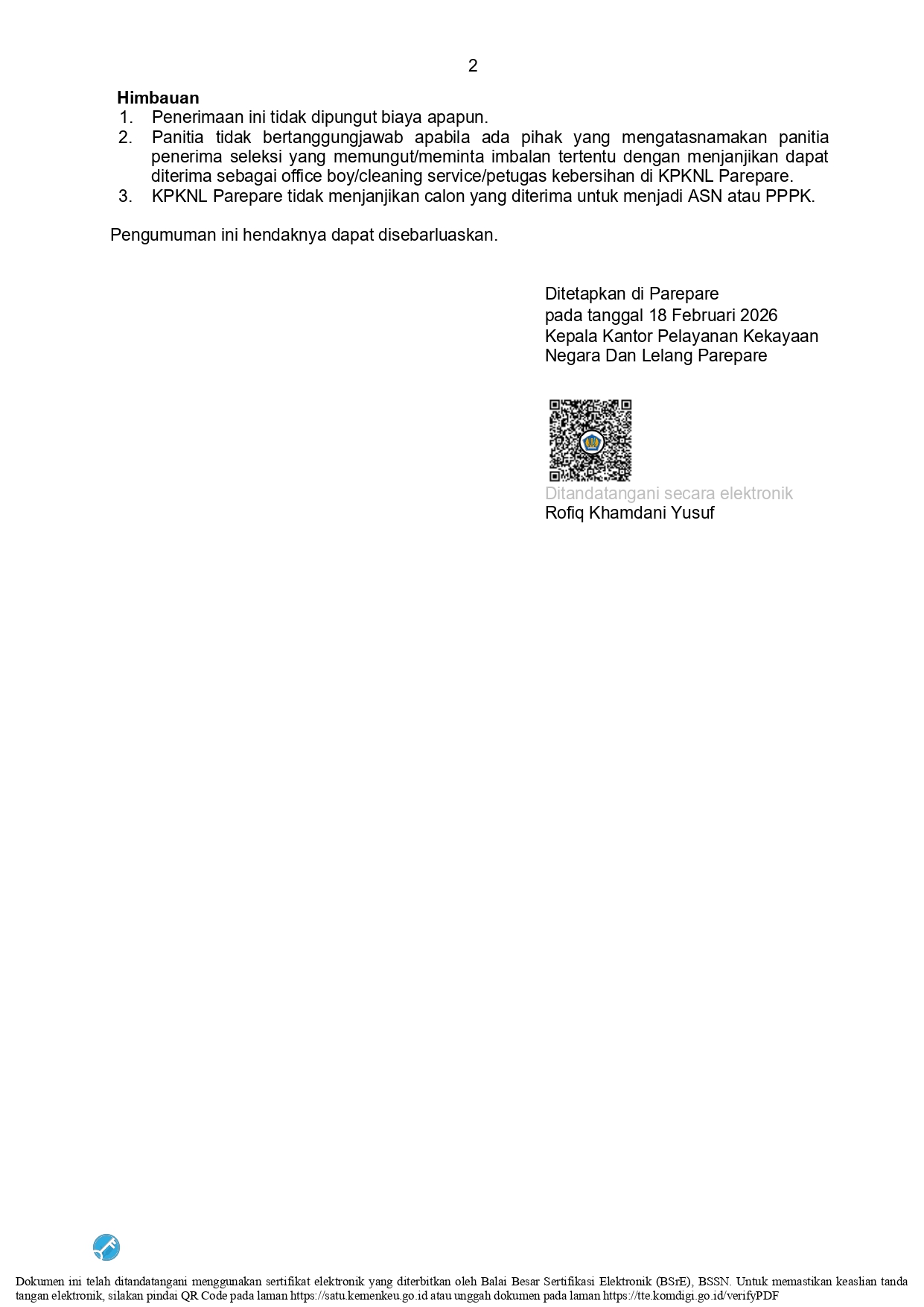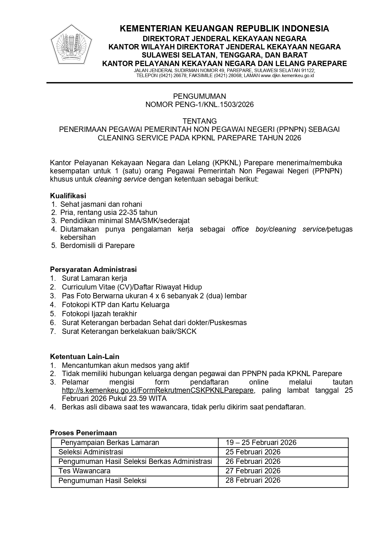 PENERIMAAN PEGAWAI PEMERINTAH NON PEGAWAI NEGERI (PPNPN) SEBAGAI CLEANING SERVICE PADA KPKNL PAREPARE TAHUN 2026
