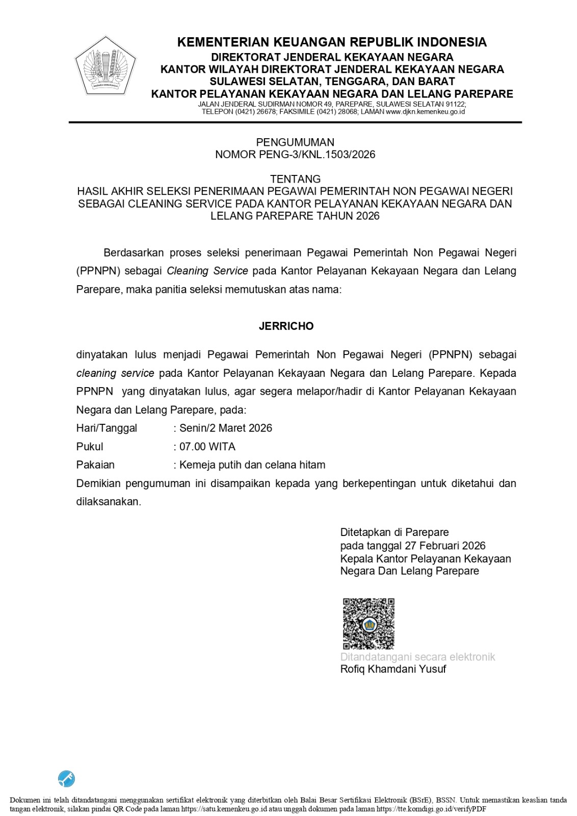 Hasil Akhir Seleksi Penerimaan Pegawai Pemerintah Non Pegawai Negeri Sebagai Cleaning Service Pada KPKNL Parepare Tahun 2026