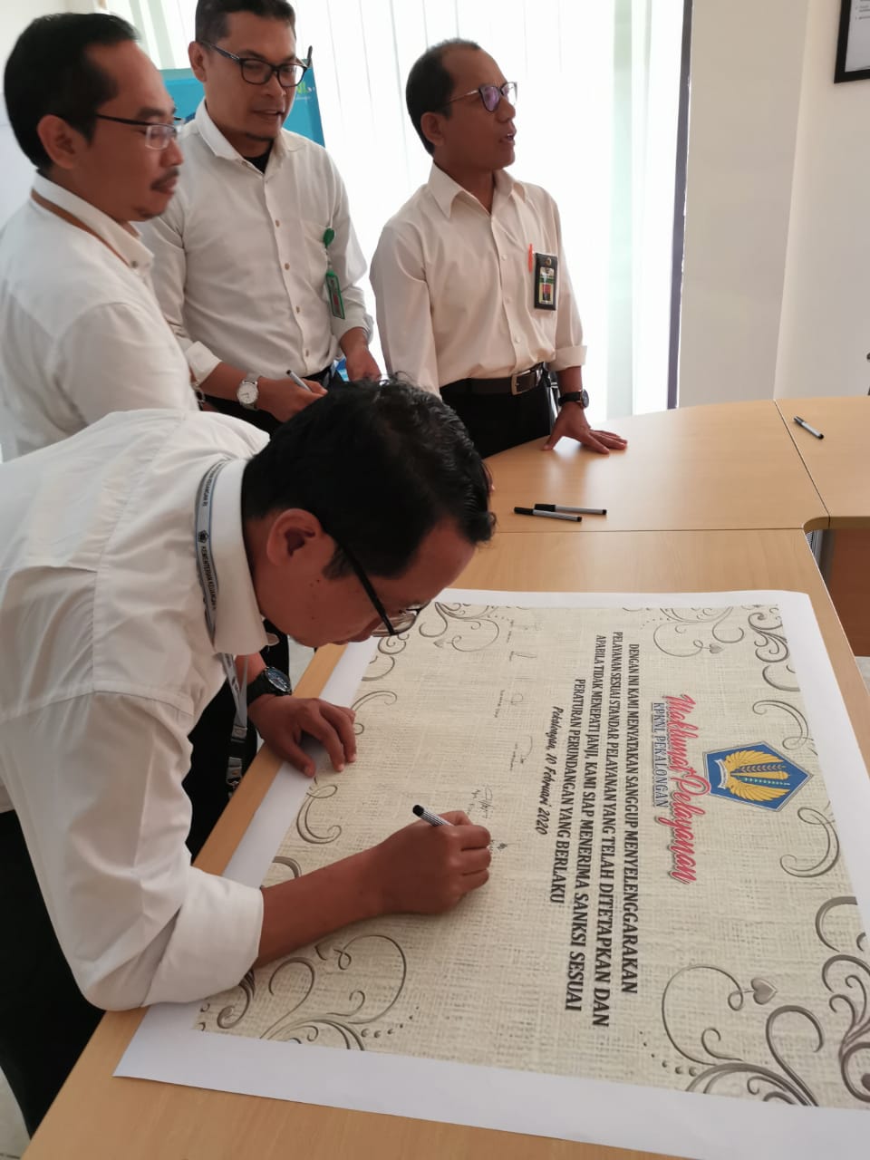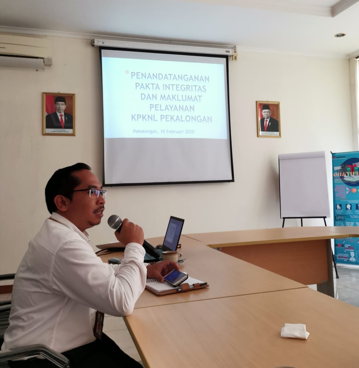 Seluruh pejabat dan pegawai KPKNL Pekalongan mengikrarkan pernyataan kesanggupan untuk menyelenggarakan pelayanan melalui Maklumat Pelayanan pada Senin, 10 Februari 2020 di ruang rapat KPKNL Pekalongan. Janji pelayanan yang bersih juga dilakukan melalui penandatangan Pakta Integritas.