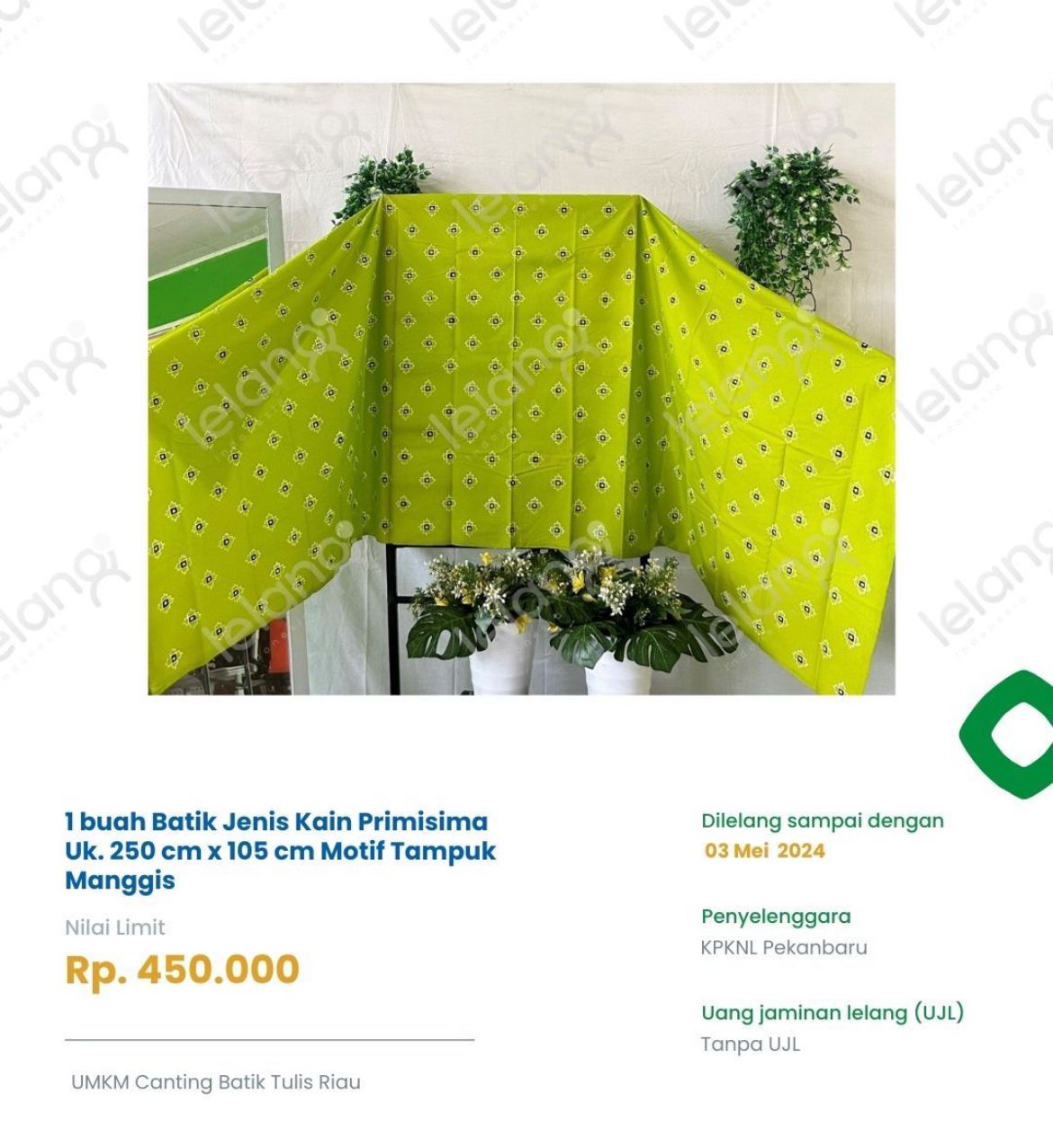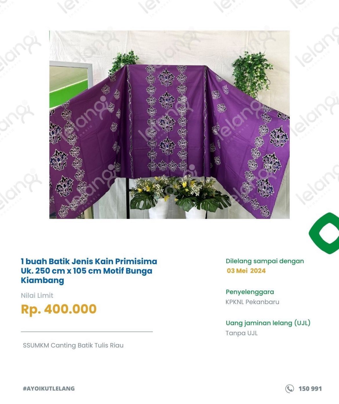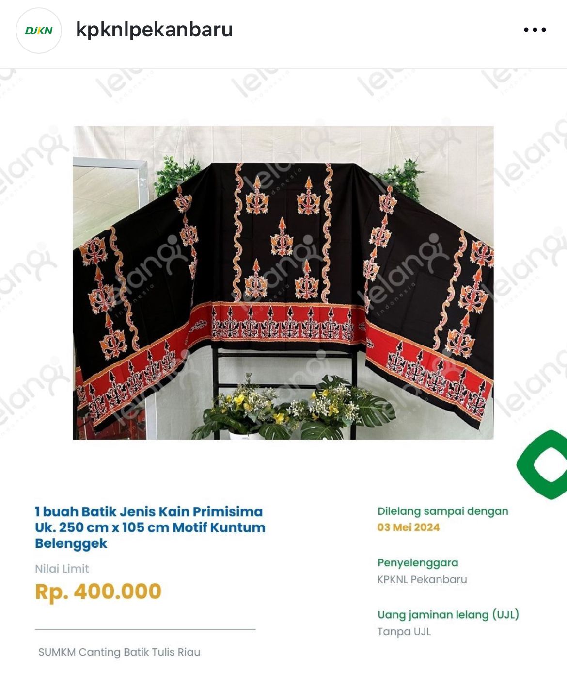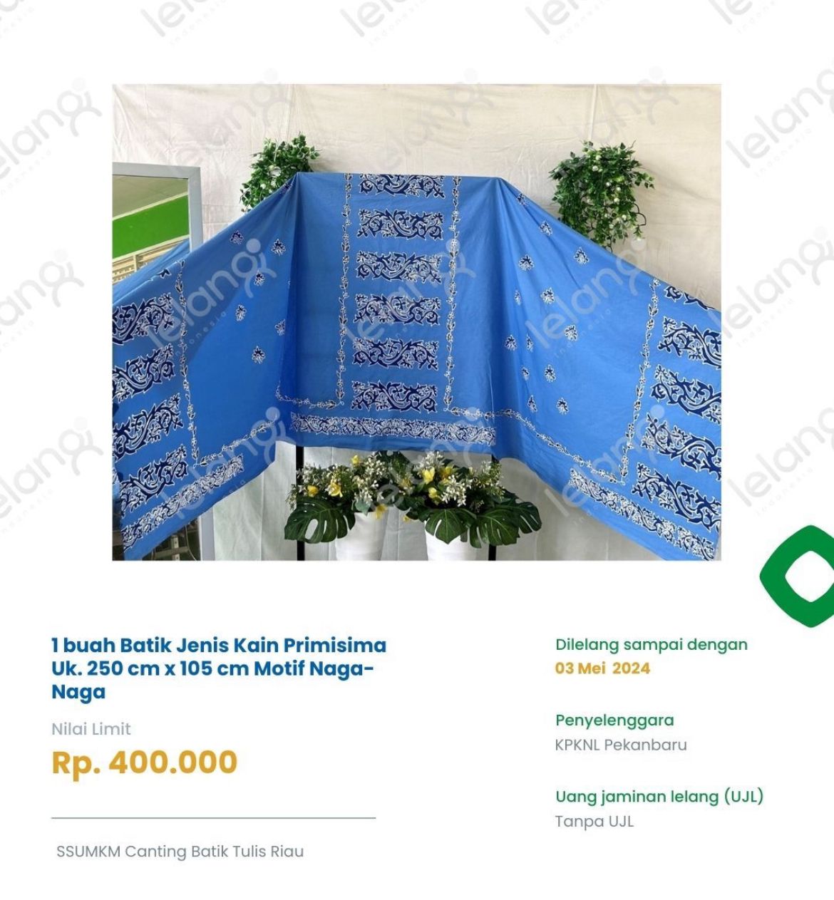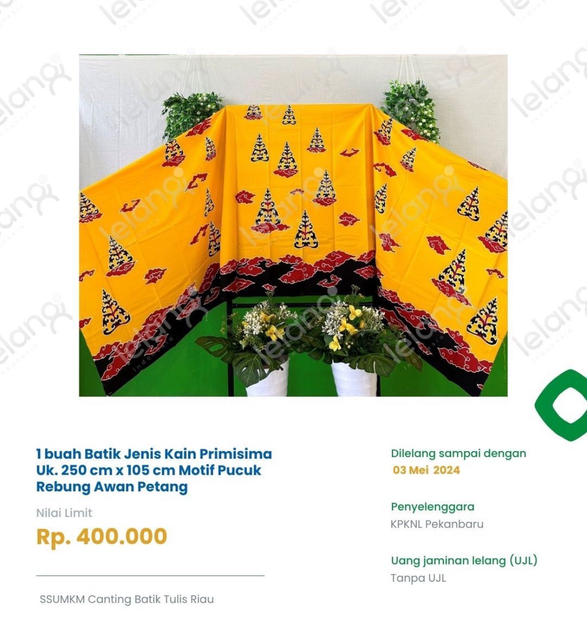 online melalui portal lelang.go.id. Salag satu produk UMUM unggulan ini adalah motif Kuntum Belenggek, Naga-Naga, Bunga