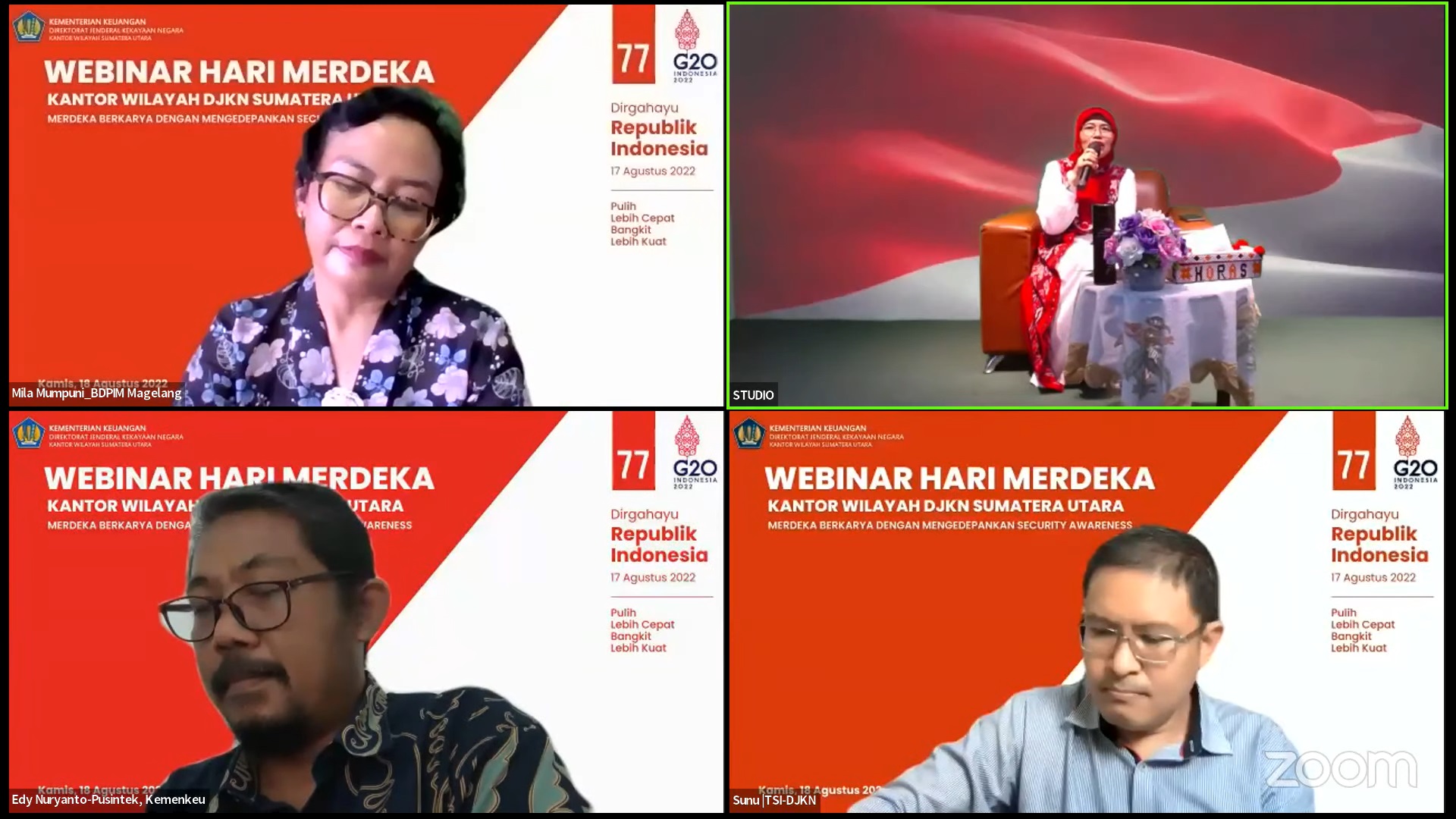 Kamis (18/08) KPKNL Pematangsiantar mengikuti Webinar bertajuk NGOBRAST (Ngobrol Asyik Transformasi) dengan topik Merdeka Berkarya dengan Mengedepankan Security Awareness yang diinisiasi oleh perwakilan Duta Transformasi di lingkungan Kanwil DJKN Sumatera Utara. Acara ini dilaksanakan secara online melalui Aplikasi Zoom dan disiarkan secara langsung melalui kanal Youtube Kanwil DJKN Sumatera Utara. NGOBRAST yang dilaksanakan pada hari ini merupakan NGOBRAST Episode ke-2. Sebelumnya, para Duta Transformasi di lingkungan Kanwil DJKN Sumatera Utara telah sukses menggelar NGOBRAST perdana di tahun 2022 yang bertepatan dengan Hari Kartini tanggal 21 April 2022, dengan topik Kartini Masa Kini, Mandiri dan Berkontribusi.