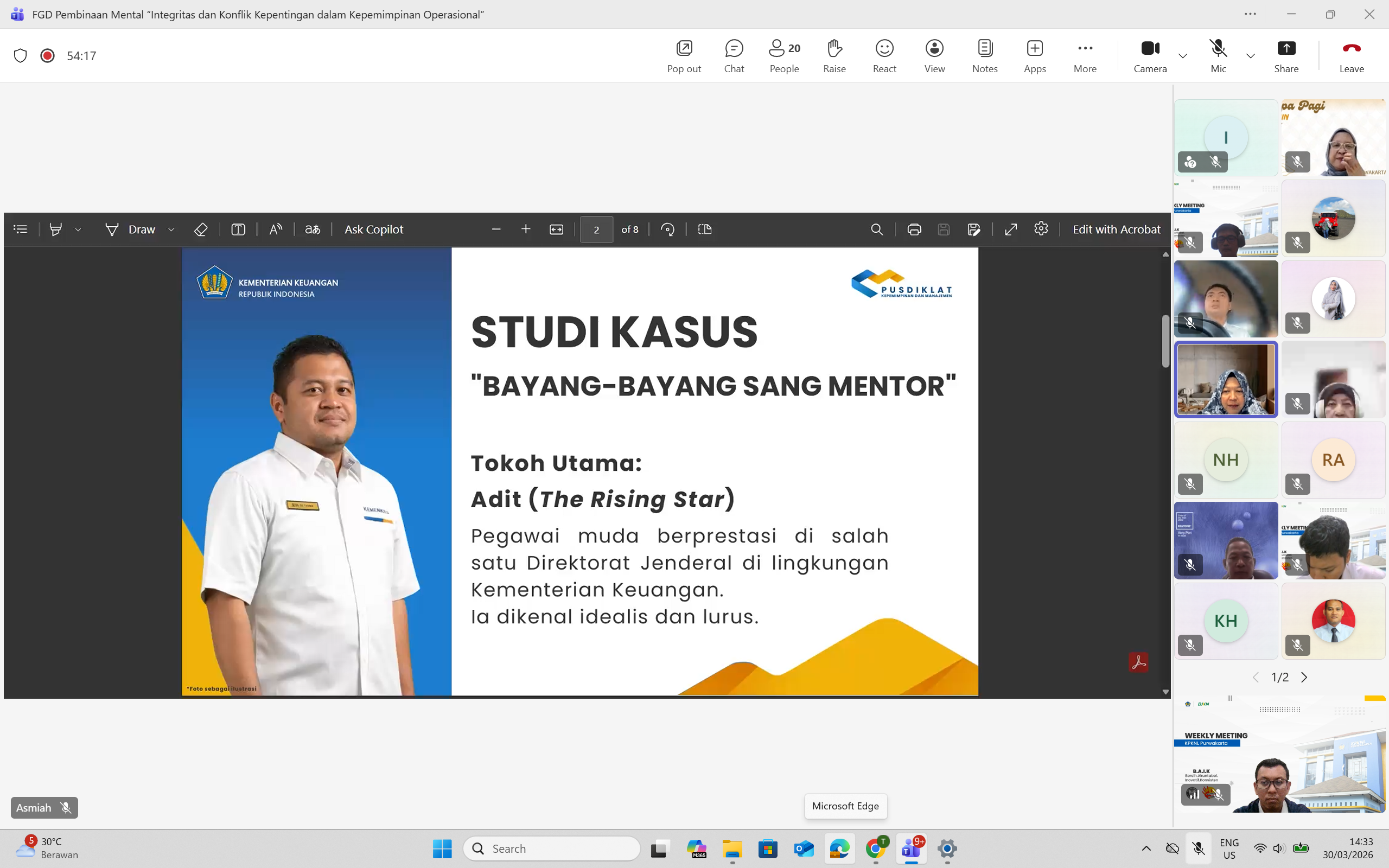 Dalam paparannya, Harmani mengangkat sebuah studi kasus berjudul “Bayang-bayang Sang Mentor” yang menggambarkan dilema etika yang kerap dihadapi pegawai. Kisah tersebut menceritakan Adit, seorang pegawai Kementerian Keuangan yang pernah dibimbing oleh Pak Baskoro, sosok mentor yang telah pensiun dan kini menjadi konsultan di sebuah perusahaan, PT X.