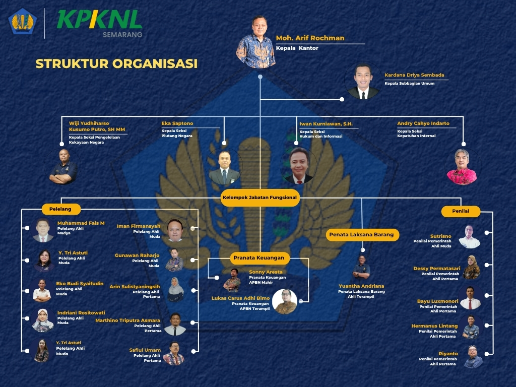 Perkenalkan, kami, Kantor Pelayanan Kekayaan Negara dan Lelang (KPKNL) Semarang merupakan Unit Kerja vertikal Direktorat Jenderal Kekayaan Negara (DJKN) Kementerian Keuangan yang berada dibawah Kantor Wilayah DJKN Jawa Tengah dan Daerah Istimewa Yogyakarta. KPKNL Semarang menempati Lantai 4 Gedung Keuangan Negara (GKN) Semarang II, yang beralamat di Jalan Imam Bonjol Nomor 1D Semarang. Lokasi KPKNL Semarang cukup strategis dan mudah dijangkau karena dekat dengan pusat perdagangan Pasar Johar, dan destinasi wisata Kota Lama.