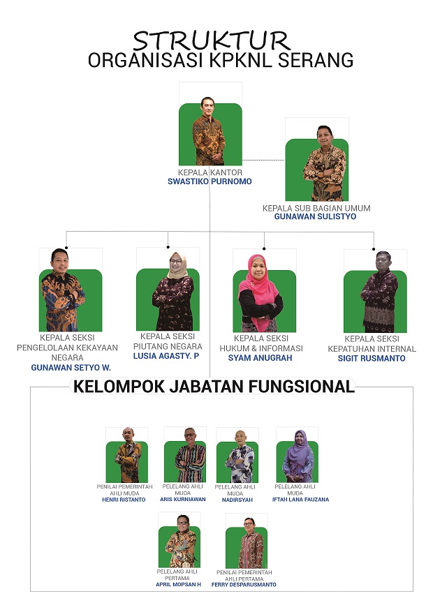 Dalam menjalankan tugas dan fungsinya, KPKNL Serang dipimpin oleh Kepala Kantor dan dibantu oleh pejabat struktural, pejabat fungsional, dan pelaksana. Total pegawai KPKNL Serang sebanyak 26 orang. Kepala KPKNL Serang saat ini adalah Swastiko Purnomo, dibantu oleh 26 pegawai yang terdiri dari 5 orang pejabat struktural, 6 orang pejabat fungsional, dan 14 orang pelaksana. Selain itu, KPKNL Serang juga didukung oleh 15 orang Pegawai Pemerintah Non Pegawai Negeri (PPNPN), yang terdiri dari 5 orang pramubakti, 3 orang tenaga kebersihan, 2 orang pengemudi,dan 5 orang satpam.